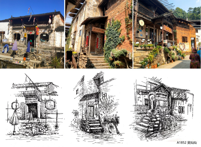 9月24日,师生团队来到历史古村落理坑,开展古村落调研与写生教学。理坑是婺源著名的徽派民居聚集地,保存着丰富的砖雕、木雕和石雕等传统民间艺术精品,其图案精美绝伦、寓意隽永,成为诸多艺术家获取创作灵感的重要源泉。在村边的小溪旁,吴小亮主任与周裕昌老师为同学们现场示范古建筑写生,详细讲解写生技巧。