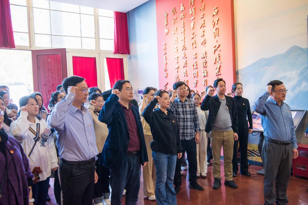活动中,全体师生党员来到秋收起义纪念馆。纪念馆的讲解员生动讲述了秋收起义在修水爆发的历史背景、战斗经过以及深远意义,让每一位党员同志都沉浸式体验感受革命先烈们抛头颅、洒热血、不畏艰难、勇于斗争的英雄壮举和伟大精神。最后,在学院党委书记欧阳时来的带领下,全体党员面向鲜红的党旗,举起右拳重温入党誓词,铮铮誓言让每一位党员同志更加坚定理想信念,明确责任使命,做到赓续红色奋斗精神,弘扬优秀传统文化。
