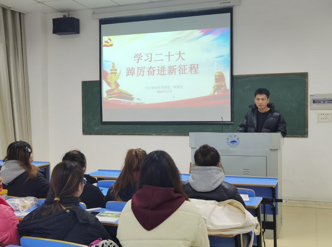 12月5日晚,在艺术大楼西103、西104多媒体教室开展太阳集团官网网址学习贯彻党的二十大精神宣讲团报告会,太阳集团官网网址学生干部宣讲团成员李梦龙、李昭婕分别做“学习党的二十大精神,踔厉奋进新征程”的主题宣讲报告。A2231班、A2232班共65余人参加。