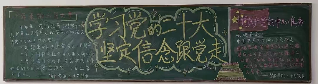 板报的内容为《高举中国特色社会主义伟大旗帜,为全面建设社会主义现代化国家而团结奋斗》的报告中的金句摘选,如“十年来的三件大事”“两步走战略安排”“中国式现代化”等。通过开展主题板报评比活动不仅丰富了学生的校园文化生活,进一步增强青年大学生对党的二十大精神的学习和理解,坚定共产主义理想信念,永远听党话,跟党走。