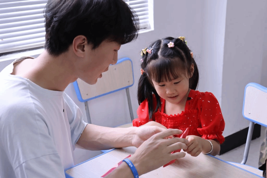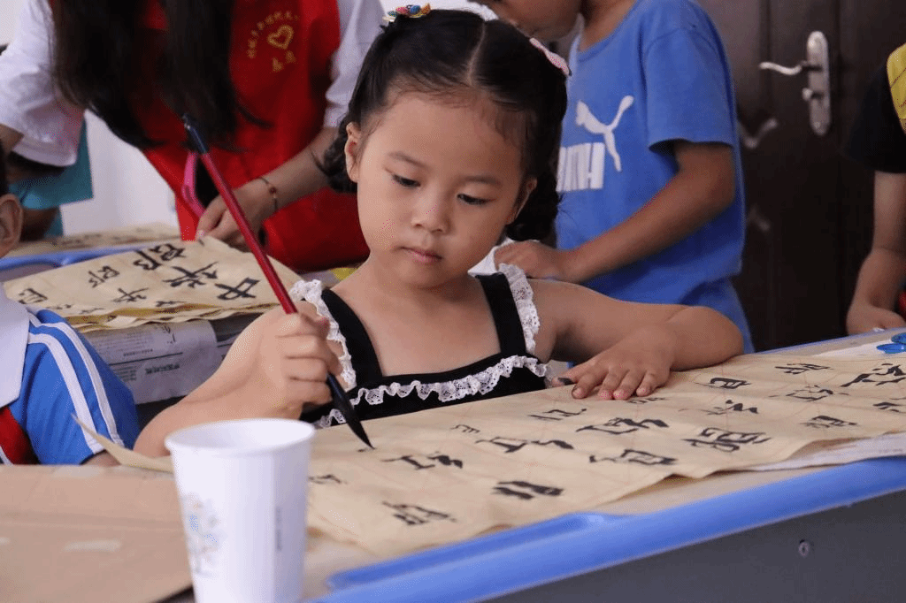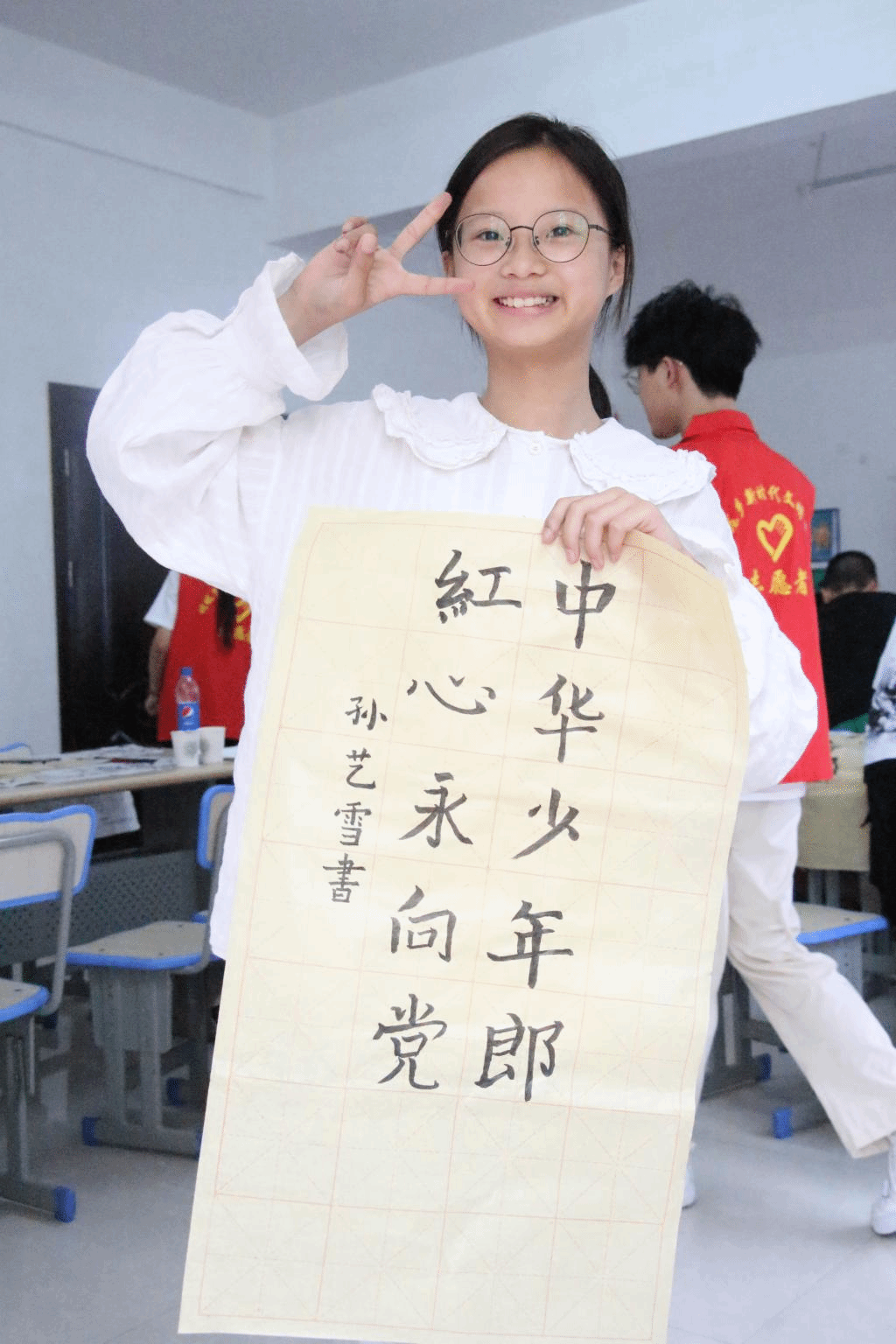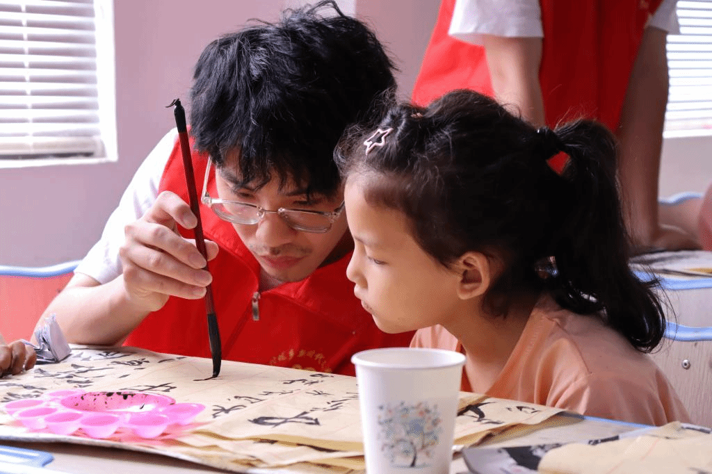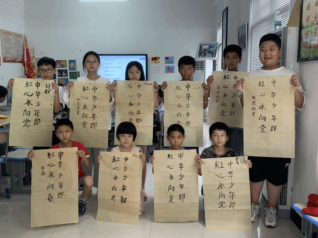 上午,队员们开设了书法课。课前,队员们给孩子讲述了书法的起源、介绍了书法和文字的演变。孩子们脸上洋溢着的是对书法浓厚的兴趣,书写着的是满满的幸福。下午的折纸课上,队员们向孩子们讲述了《闪闪的红星》,故事讲述的是一个名叫潘冬子的少年带着父亲留下的红星,步步成长为了红军战士。潘冬子的故事让孩子们更了解了红色革命精神。