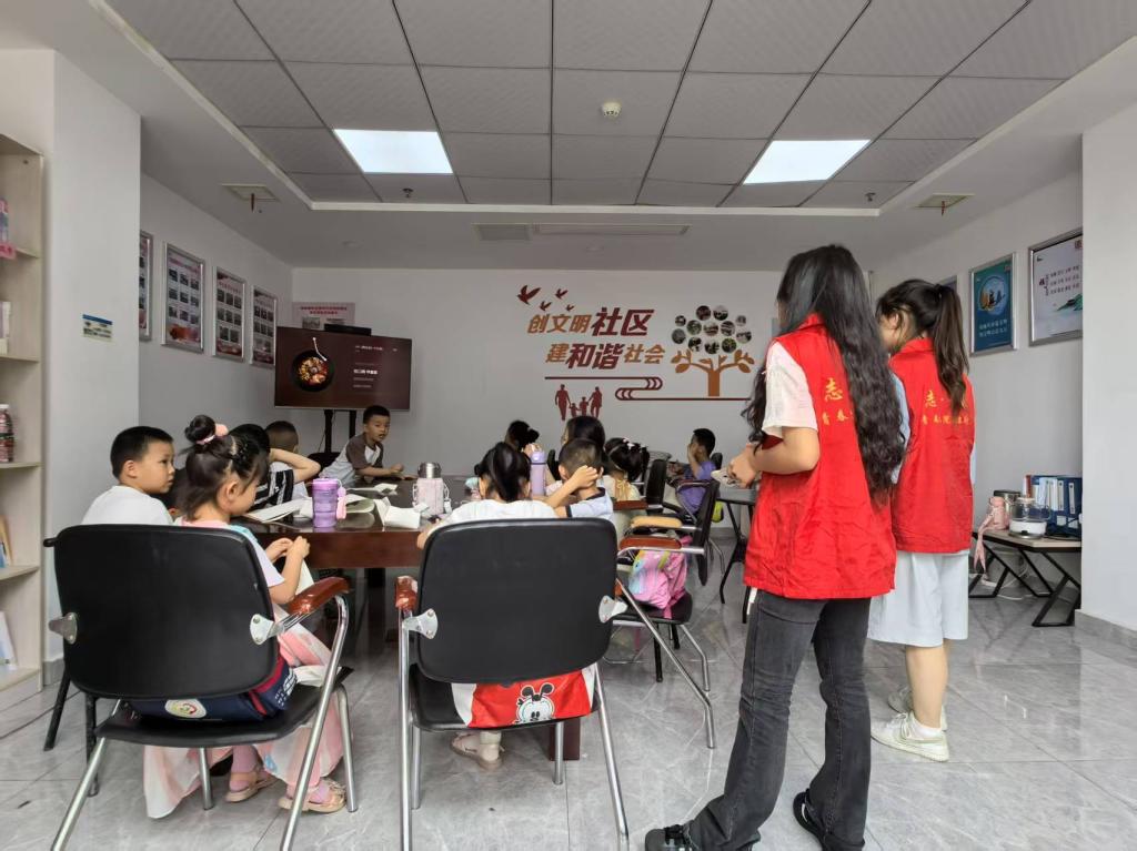 “龙舟的尾巴要画得翘起来,这样才像在水里飞驰哦!”上午9点半,社区活动室的绘画课堂上,志愿者小林跪坐在孩子们身旁,耐心指导他们用画笔勾勒端午场景。4名志愿者分工协作,一人主讲、三人辅助,以“端午印象”为主题,引导孩子们用蜡笔、水彩描绘心中的节日画面。6岁的妞妞用绿色波浪线涂满画纸:“这是汨罗江,屈原爷爷站在江边作诗!”而9岁广浩浩则用金色点缀龙舟鳞片,自豪地展示:“我的龙舟能带全村人一起过端午!”短短一小时,20余幅色彩斑斓的作品挂满展示墙,志愿者们还为每幅画配上童趣解说,制成“儿童眼中的端午”主题画展,吸引社区居民驻足称赞。