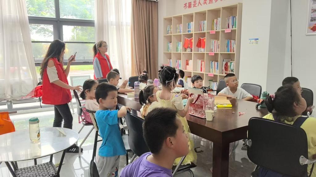 尽管场地有限,志愿者们创意设计了“桌面龙舟赛”。用纸板、吸管制作的迷你龙舟在塑料水池中“竞渡”,孩子们用吸管吹动龙舟前行,欢呼声此起彼伏。“我们组的小龙舟最先‘游’到终点!因为它有 能量!”10岁的航航和伙伴们击掌庆祝。游戏结束后,志愿者顺势讲述屈原爱国故事,将竞技乐趣升华为文化熏陶。