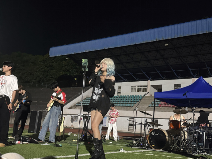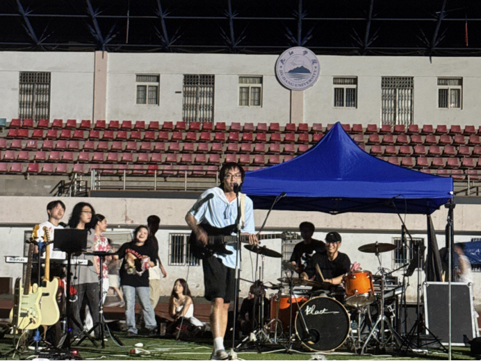 七点整,一支校园乐队登台表演。主唱的嗓音、吉他的旋律、贝斯的节奏、架子鼓的鼓点交织,一首原创摇滚曲目带动了现场。台下同学拍手、欢呼,将氛围推向了顶点。