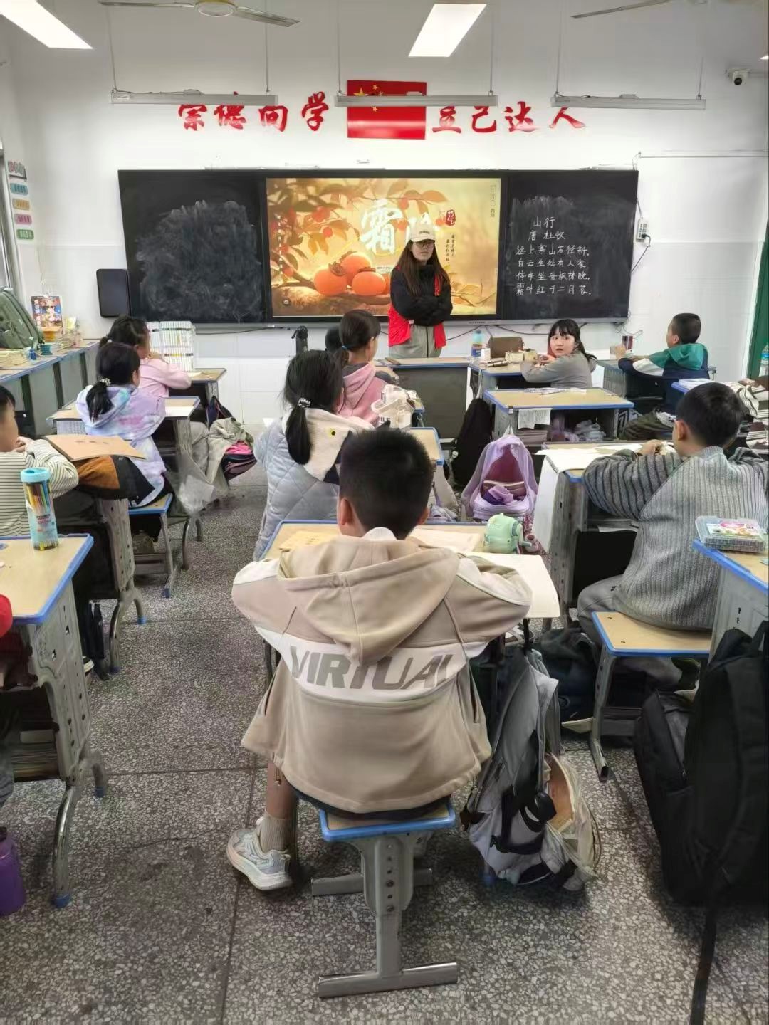 最后到了展示环节,志愿者们化身最热情的“观众”,在教室里巡回欣赏,时不时发出真诚的赞叹。“你们看,我们班的小画家们多厉害!每一幅画都独一无二,都是最棒的!”有人花了带霜的柿子,有人画了火红的枫叶,有人更是画出来会自动长出庄稼的粮仓……在志愿者的带领下,教室里响起了热烈的掌声,每个孩子的脸上都洋溢着自豪的笑容。孩子们纷纷举起自己的作品向志愿者展示,脸上洋溢着自豪的笑容。孩子又将自己的作品送给志愿者作为纪念。一张画纸,一支画笔,连接起志愿者与孩子们的纯真情谊,共同留下了一段温暖而美好的秋日回忆。