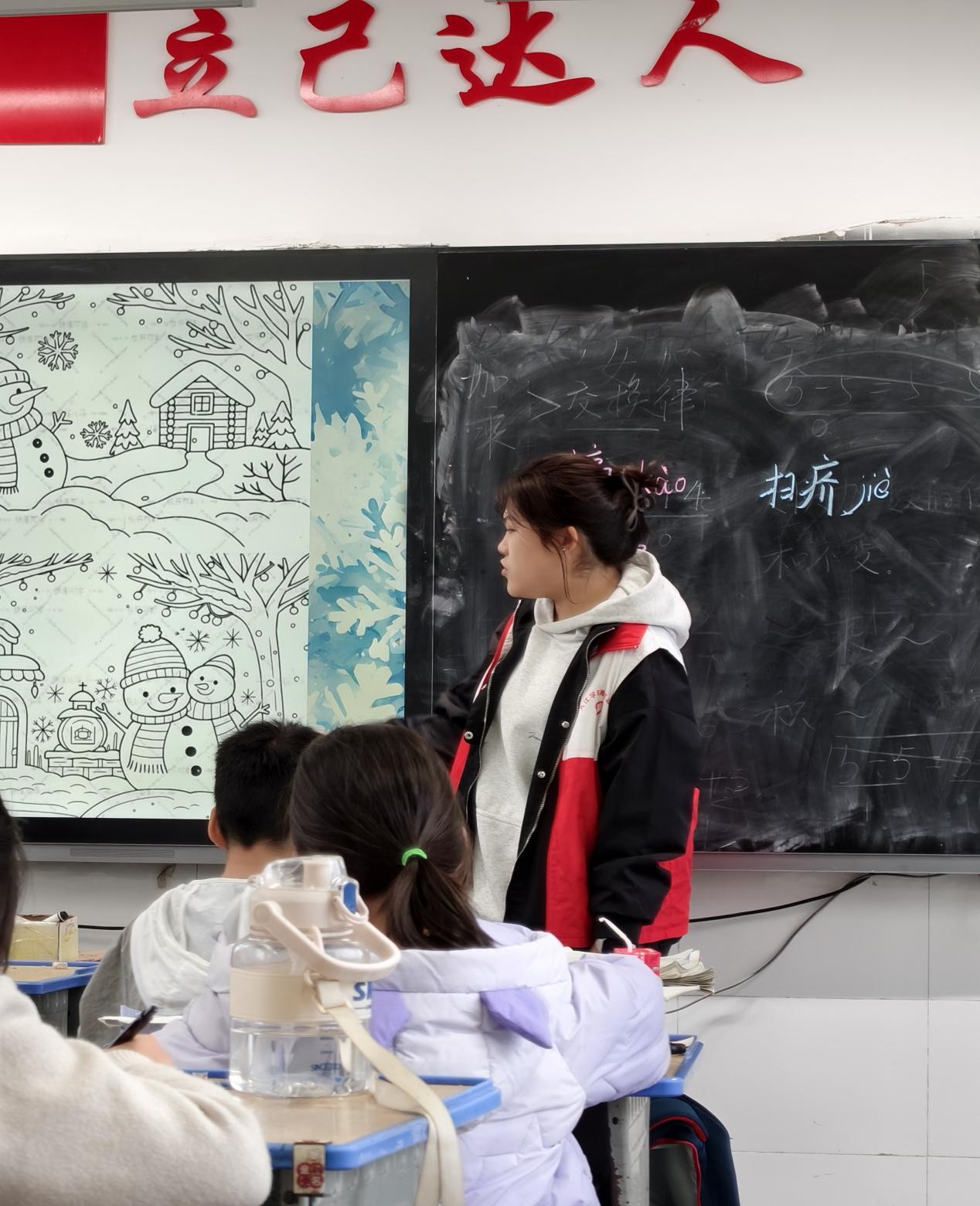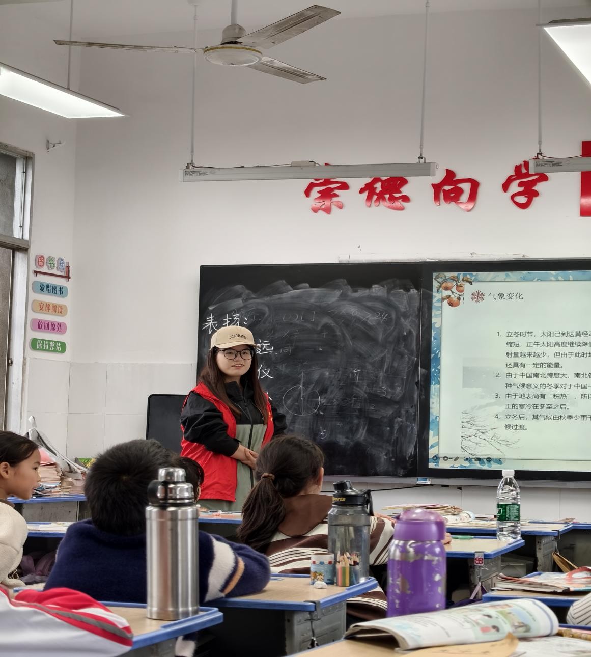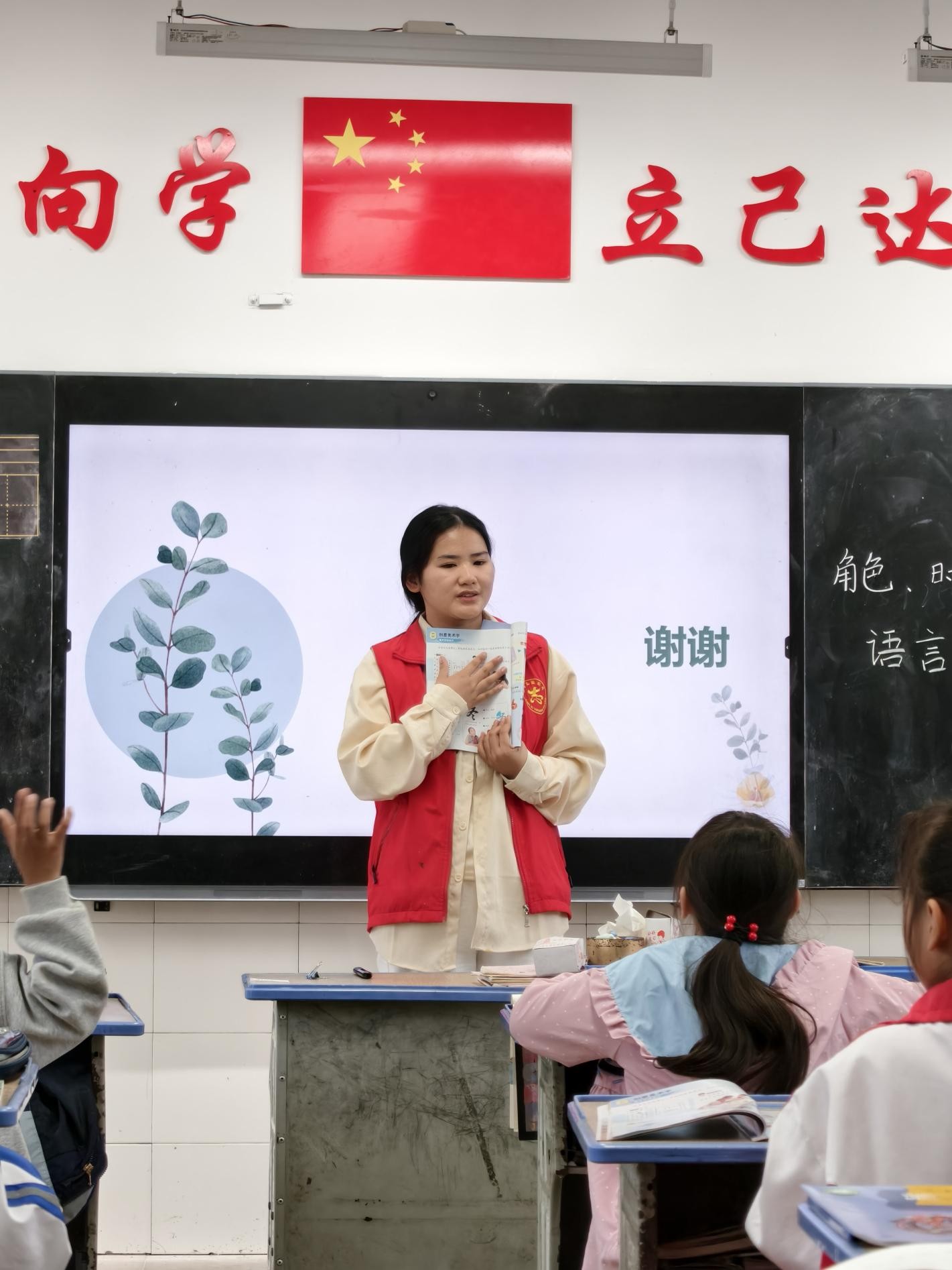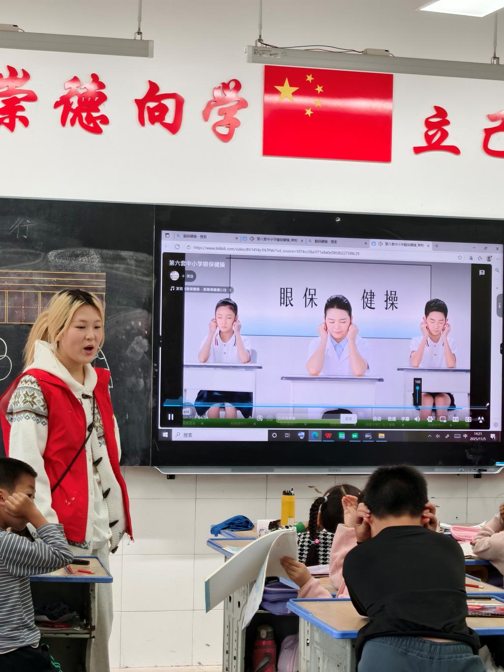 二年级的课堂则围绕“爱眼护眼”展开。志愿者们先逐节示范眼保健操的标准动作,详细讲解每一节的穴位和按摩方法,边示范边纠正孩子们的动作细节。在舒缓的音乐声中,孩子们挺直腰板, 跟着老师的节奏认真按压穴位,从“按揉睛明穴”到“揉捏耳垂脚趾抓地”,每一个动作都做得有模有样,课堂上洋溢着专注而认真的氛围。