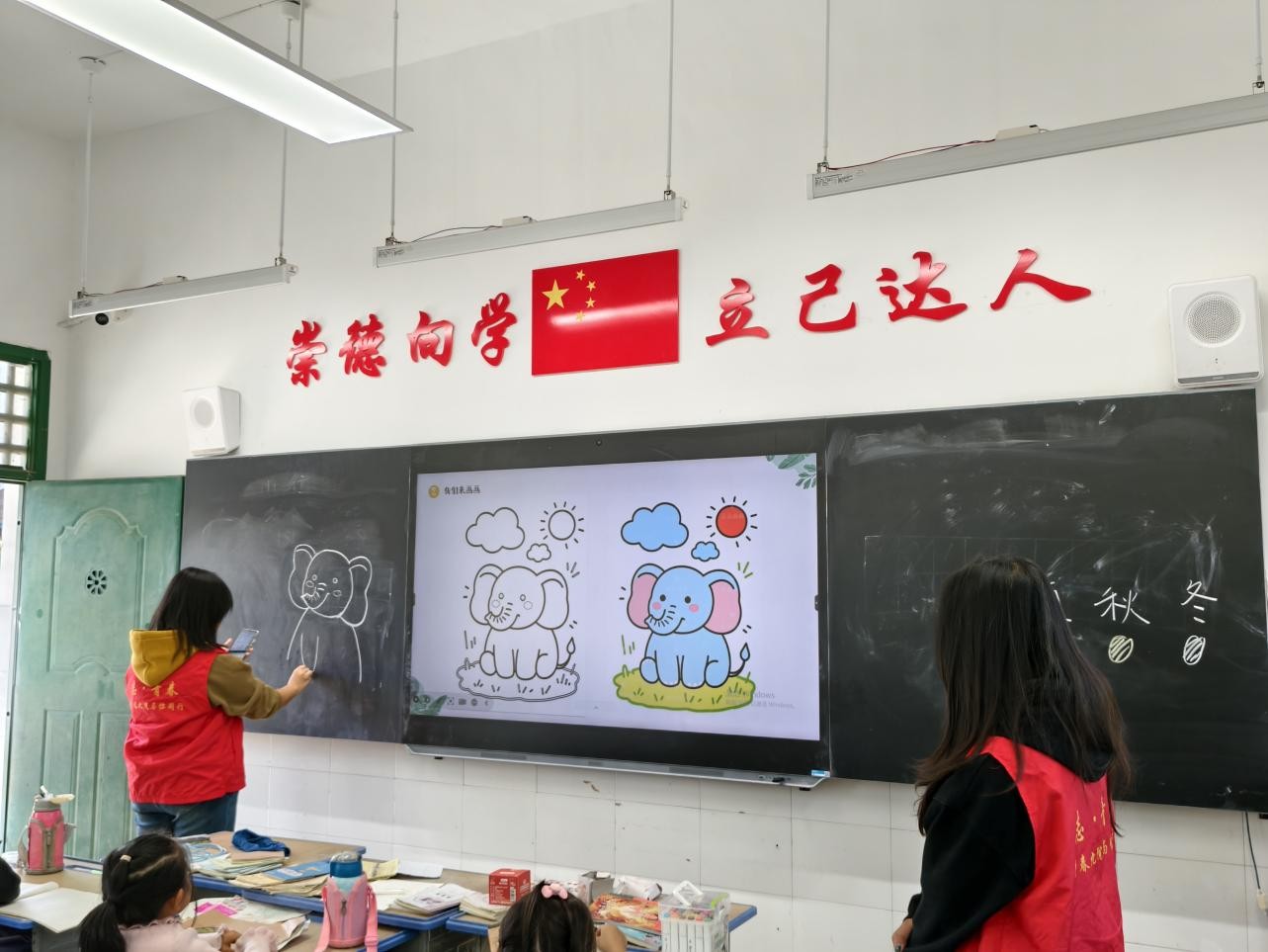 在一年级的教室里,“四季的色彩”主题绘画课正生动展开。志愿者们通过精美的四季图片和互动问答,引导孩子们观察自然界的色彩变化。孩子们在志愿者的耐心指导下,用稚嫩而真诚的笔触,将春天的嫩绿、夏天的湛蓝、秋天的金黄和冬天的洁白描绘于画纸之上,完成了属于自己心中的四季图景。