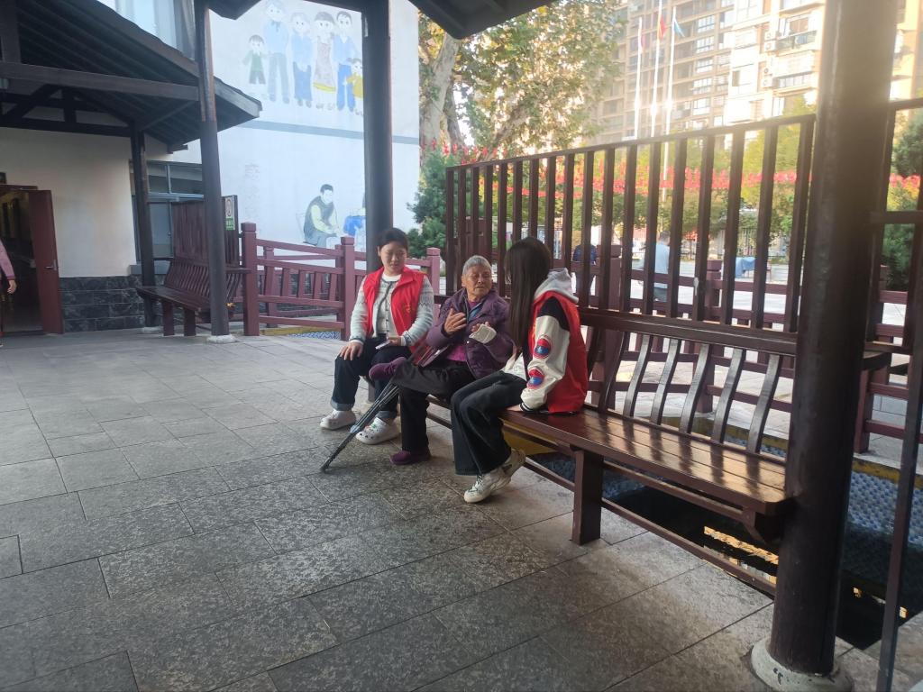 两个小时的陪伴时光里,志愿者们始终保持耐心,以最真挚的态度对待每一位老人:有的为老人捶背按摩,缓解身体疲劳;有的坐在老人身边,静静倾听他们的峥嵘岁月;还有的搀扶着老人,在午后阳光下慢慢舒展身体,让老人们的脸上始终洋溢着幸福的笑容。长亭下,一位奶奶紧紧拉着志愿者的手,声音轻颤却格外清晰:“我的爷爷是革命烈士,他总说要我们好好读书,这话我记了一辈子……”风拂树叶沙沙作响,阳光暖得让人安心,奶奶的讲述里,革命精神与坚守初心悄然交织,格外动人。