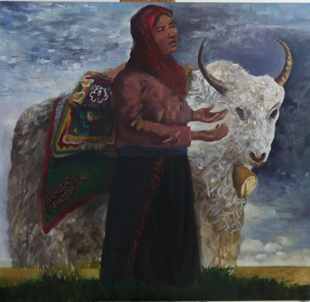 作品说明:以虔诚纯朴的牧民与耗牛为主题,体现出人与自然的关系是相辅相成的,原始,本真,自然纯净。牧民与牲畜相互依存,白色的耗牛寓意着吉祥如意,天空背景大气肃穆,牧民抬着头,微张嘴,双手掌心向上,祈祷着风调雨顺。