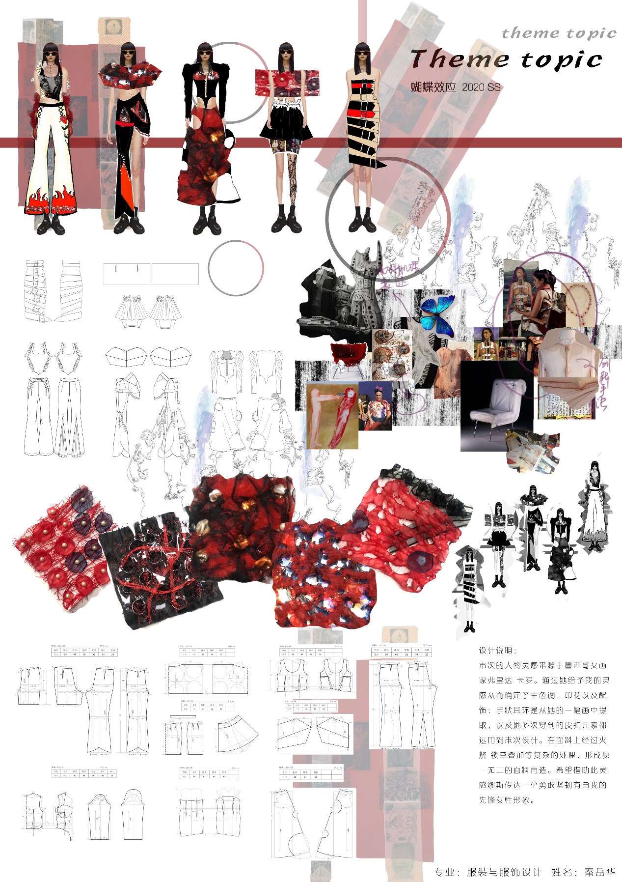设计说明:本系列设计灵感来源于墨西哥女画家弗里达为灵感缪斯,从她的先锋日常穿着以及绘画中提取元素进行面料再造,通过叠加、火烧、镂空、刺绣等多重复杂工艺,从而保证面料的独特性和先锋性。希望通过此次服装设计传达出一个勇敢坚韧有自我的先锋女性形象。