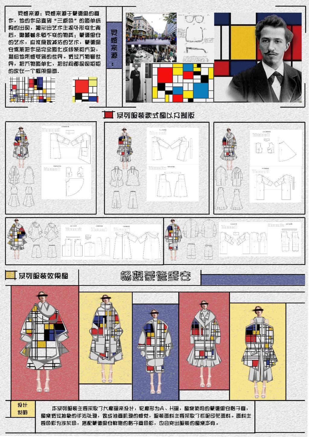 设计说明:本系列服装主要采取了大廓型来设计,廓形为A或H型,图案使用的是蒙德里安绘画作品,将图案通过抽象的手法处理,做成油画肌理效果,服装面料主要采取了毛呢印花面料。面料主要色彩为浅灰色,搭配蒙德里安鲜艳的格子画色彩,也能突出服装的图案本身。线条和色彩的有机结合,形成和谐的节奏感。