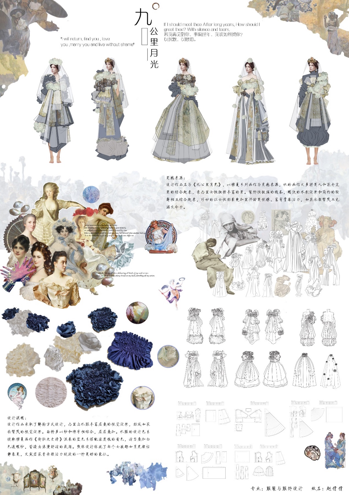 设计说明:作品在结构上采用了A型和H型廓形,解构方式设计。同时应用到了抽褶、层叠和堆积等面料再造工艺手法,凸显出礼服丰富层叠的视觉效果,后将穆夏的画作风格结合到抽褶礼服的设计中,将大量的抽褶花饰以堆积层叠的方式应用到礼服的设计中,形成如花朵繁茂的视觉效果。面料多以纱和棉布相结合,层层叠加。礼服的设计色系提取穆夏画作《斯拉夫史诗》温柔的蓝色系搭配浓度低的黄色,适当叠加白色透明纱,营造出浪漫舒适的氛围。整体设计体现了每个女孩都如月光般恬静柔美,又宛若花骨朵般活力绽放的美好的象征。