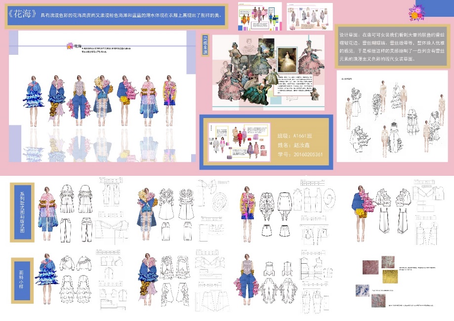 设计说明:灵感来源于洛可可风格。在这种风格的女装里,我们可以看到大量的层层叠叠的蕾丝褶皱花边、裙摆上的蕾丝缎带、蕾丝蝴蝶结、蕾丝花卉纹案布料以及布满头部的蕾丝发鬓装饰,整体给人美丽优雅的感觉。此次设计作品将洛可可风格与现代女装相结合,在打造复古的浪漫主义色彩的同时,还呈现出了现代主义的简约风格。洛可可时期的色彩通常用金色、粉色、粉绿、淡黄等娇嫩的颜色,这些颜色呈现出了柔和艳丽的色调,再配上蕾丝花边,使整个服装显得极为浪漫雅致、柔美细腻。本作品根据18世纪洛可可风格,设计出了一套含有蕾丝元素的浪漫主义色彩的现代女装。