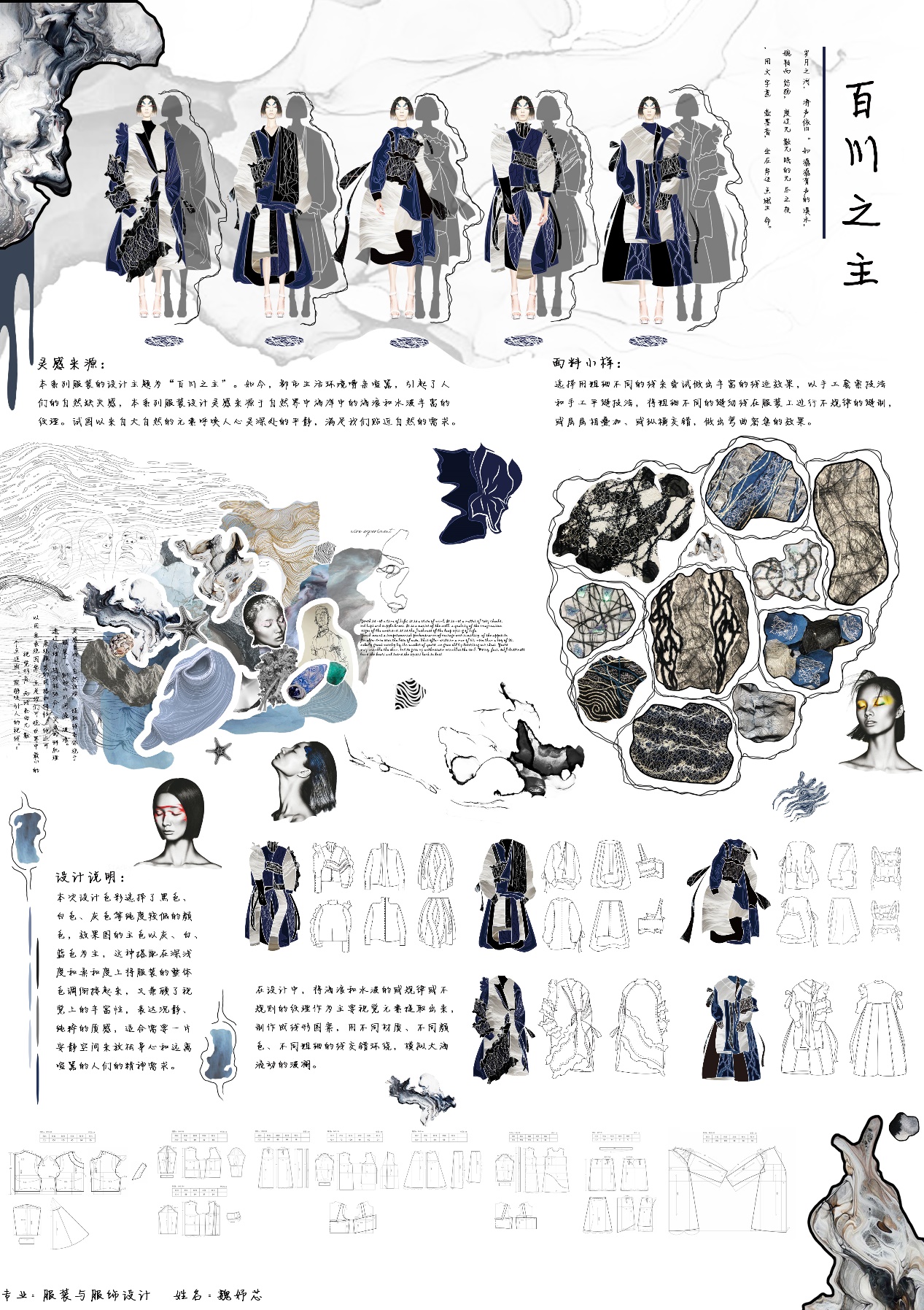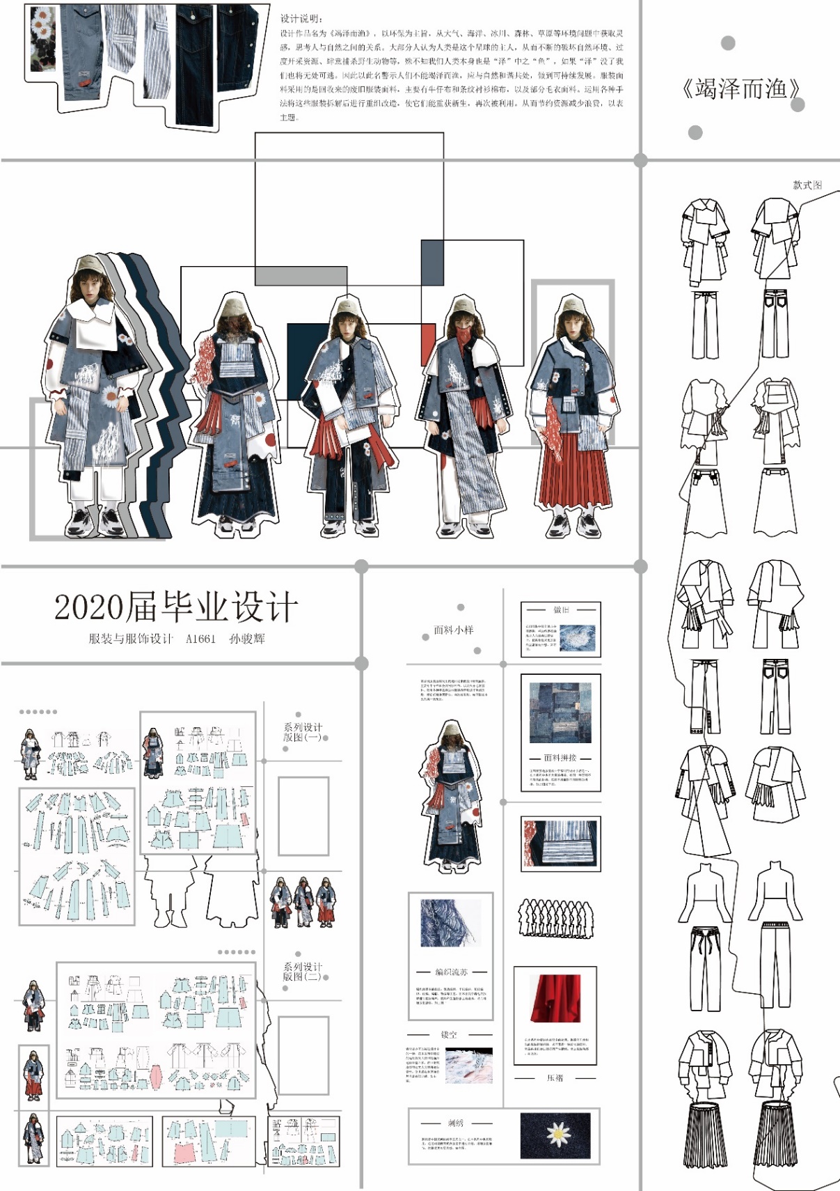 设计说明:作品以环保为主旨,从大气、海洋、冰川、森林、草原等环境问题中获取灵感,思考人与自然之间的关系。大部分人认为人类是这个星球的主人,从而不断的破坏自然环境、过度开采资源、肆意捕杀野生动物等,殊不知我们人类本身也是“泽”中之“鱼”,如果“泽”没了我们也将无处可逃。作品以此名警示人们不能竭泽而渔,应与自然和谐共处,坚持可持续发展。另外设计作品中所用材料都将采用回收来的废旧服装,对其进行再次设计利用,从而节约资源减少浪费,以表主题。