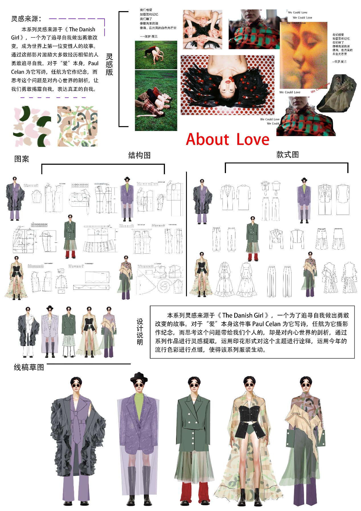 设计说明:本系列灵感来源于《The Danish Girl》,一个为了追寻自我做出勇敢改变的故事。对于“爱”本身这件事Paul Celan为它写诗,任航为它摄影作纪念,而思考这个问题带给我们个人的,却是对内心世界的剖析,通过他们的系列作品进行灵感提取,运用印花工艺对这个主题进行诠释,运用今年的流行色彩进行点缀,使得该系列服装生动。