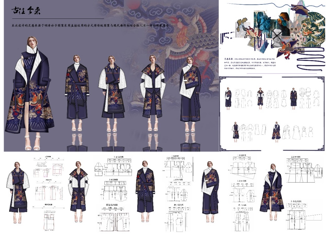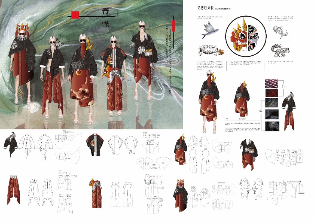 设计说明:作品把《山海经》异兽元素用当下新潮服装形式展现出来。通过服装作为载体,让人们可以更加直观的去切身感受传统文化魅力。用这门行走的艺术在传承中砥砺新生,被更多的年轻人所看到、喜爱、接纳,并对传统文化产生兴趣,做到传统文化与现代设计共生。