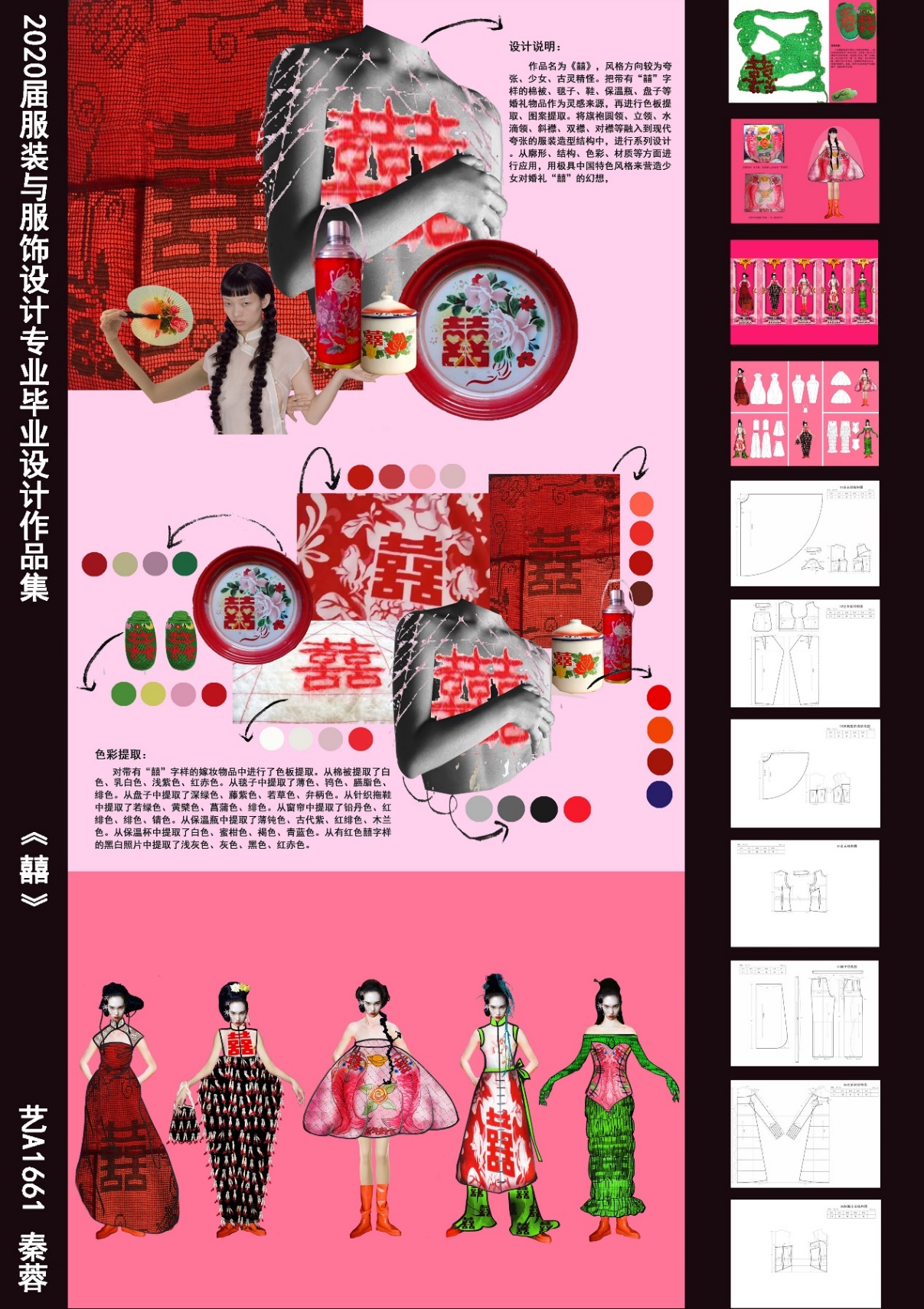 设计说明:俗话说“双喜才是囍”,灵感来源于带有“囍”字样的传统婚礼物品。根据灵感来源从棉被、毯子、窗帘、保温瓶、水果盘等婚礼物品中,进行色板提取和图案提取。并从廓形、结构、色彩、材质等方面,将旗袍的领襟元素融入到服装设计中。希望在传承中创新,在保留传统旗袍领襟结构特征的同时,结合现代审美进行创新设计,从而来传承旗袍文化。用极具中国婚礼特色的图案,以及旗袍领襟元素进行系列设计,来表达“我”对婚礼“囍”的幻想。