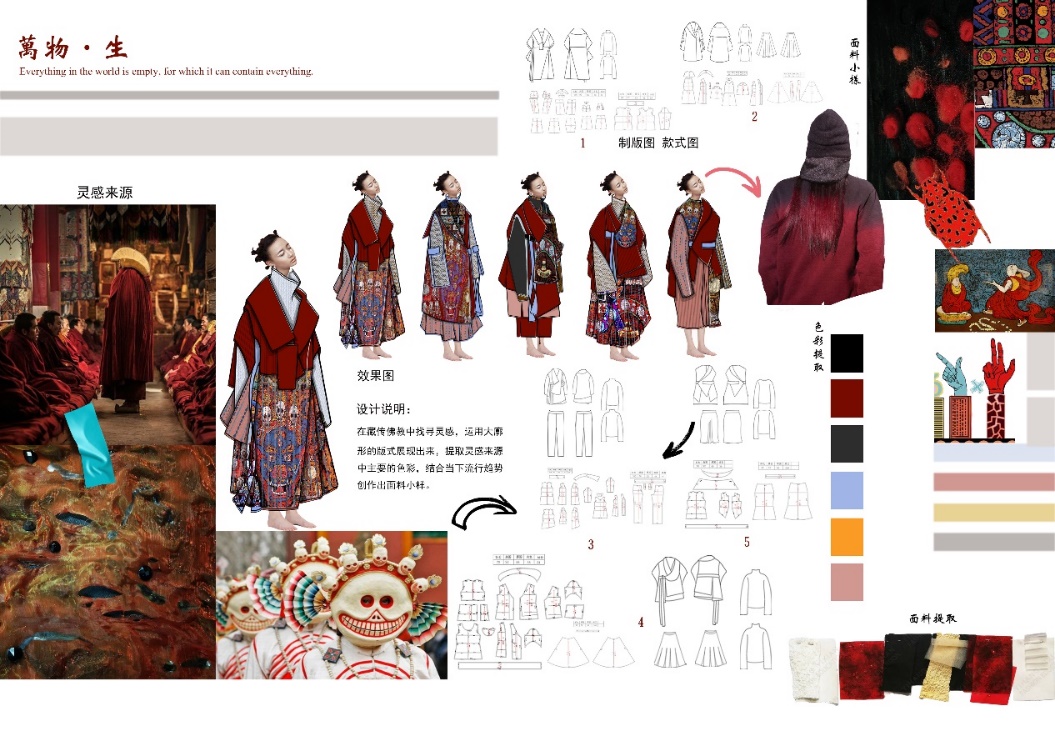 设计说明:本设计的灵感来源来自藏族的“藏传佛教”,而在藏传佛教中有一种叫做“金刚法王舞”的宗教性舞蹈,这种舞蹈由僧人戴着狰狞的面具,身着五彩的法衣,手拿法器伴随着震撼人心的音乐在人群中舞动,他们用手势、肢体语言表达着各种佛教密意,以此渡化众生、驱邪除魔、祈祷新的一年风调雨顺、农畜兴旺。所以在这次设计中,我提取了与藏传佛教中有关的色彩、纹样、图腾、以及特殊服装中特殊的肌理,作为本次设计的主要创作灵感。