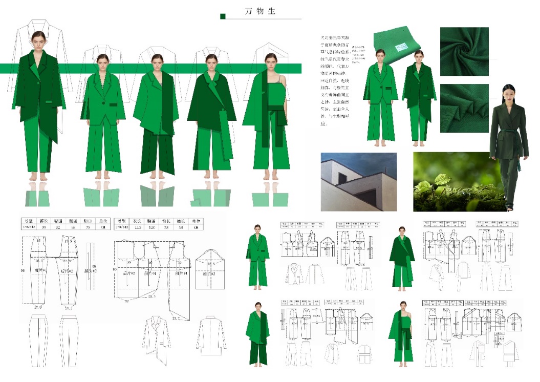 设计说明:服装中采用的色彩来源于雨后夹杂的青草气息的绿色系。绿色是代表春天的颜色,代表万物复苏的精神,回返自然,返璞归真,与极简主义有着异曲同工之妙。本系列服装主张自然简洁,贴合人体,与主题相呼应。