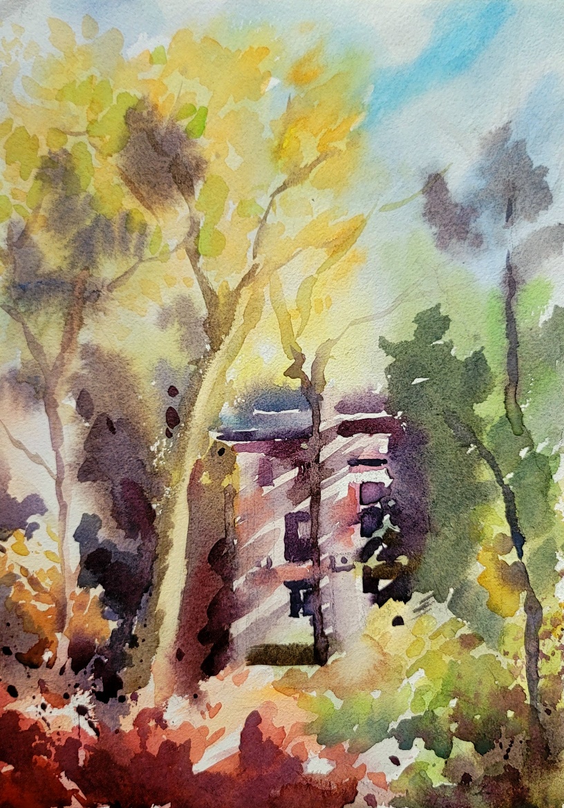 秋天的庐山,阳光明媚,秋意正浓,色彩丰富,层次明显,最适合色彩明快诗意简洁的水彩艺术表现。