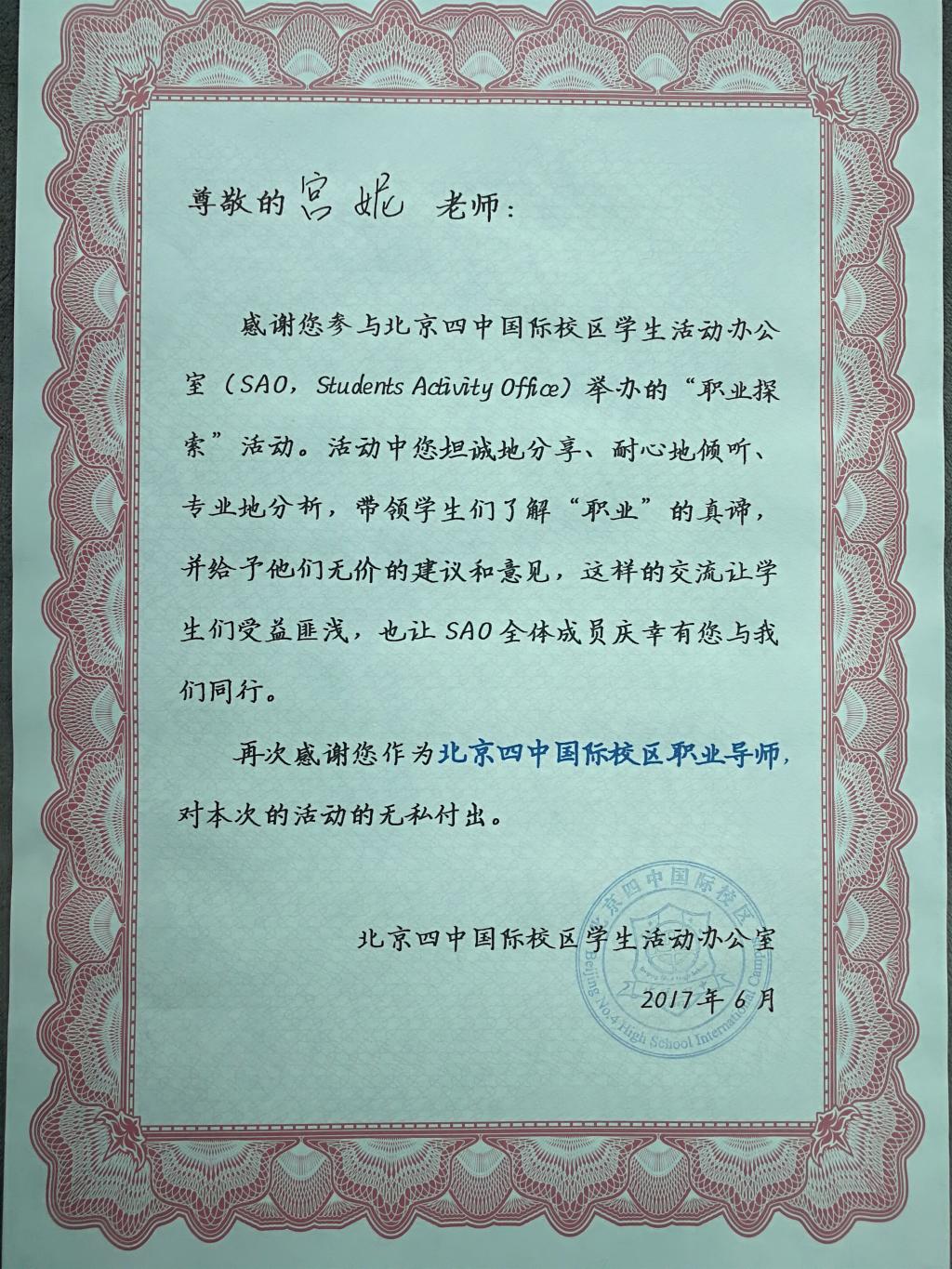 9、 2017年6月,任北京四中国际校区职业导师。