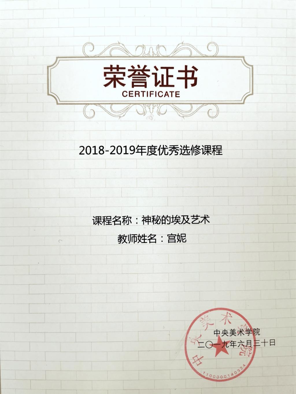 7、2019年6月,所设计和讲授的课程《神秘的埃及艺术》获评中央美术学院“2018-2019学年”年度全院优秀选修课程并荣誉证书和奖金。