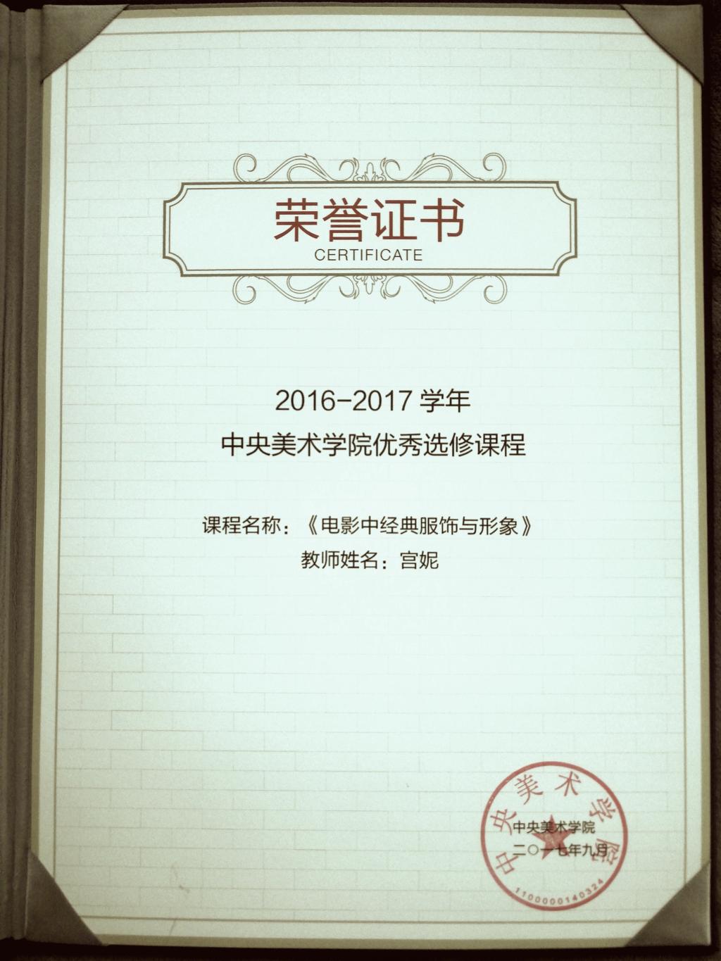 6、 2017年9月,所设计和讲授的课程《电影中的经典服饰与形象》获评中央美术学院“2016-2017学年”年度全院优秀选修课程并荣誉证书和奖金。