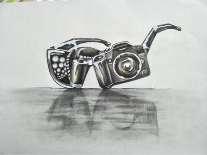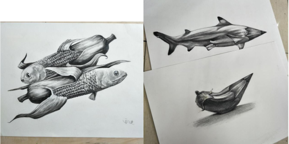 设计说明:利用鱼和玉米的结合、铅笔和鱼、茄子的结合、相机与眼镜的结合,构成一个新的物品。