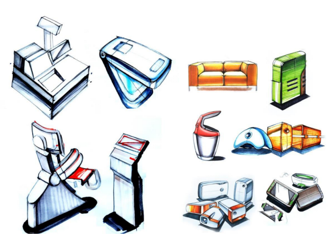 设计说明:运用不同的表现手法,例如:彩铅、马克笔、色粉等,表现出产品不同的形体和不同的材质。