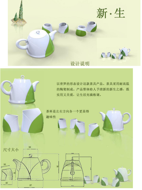 设计说明:以青笋的形态设计这款茶具产品,采用耐高温的陶瓷职称,产品整体给人以清新的新生之感,既实用又美观,让生活充满格调。