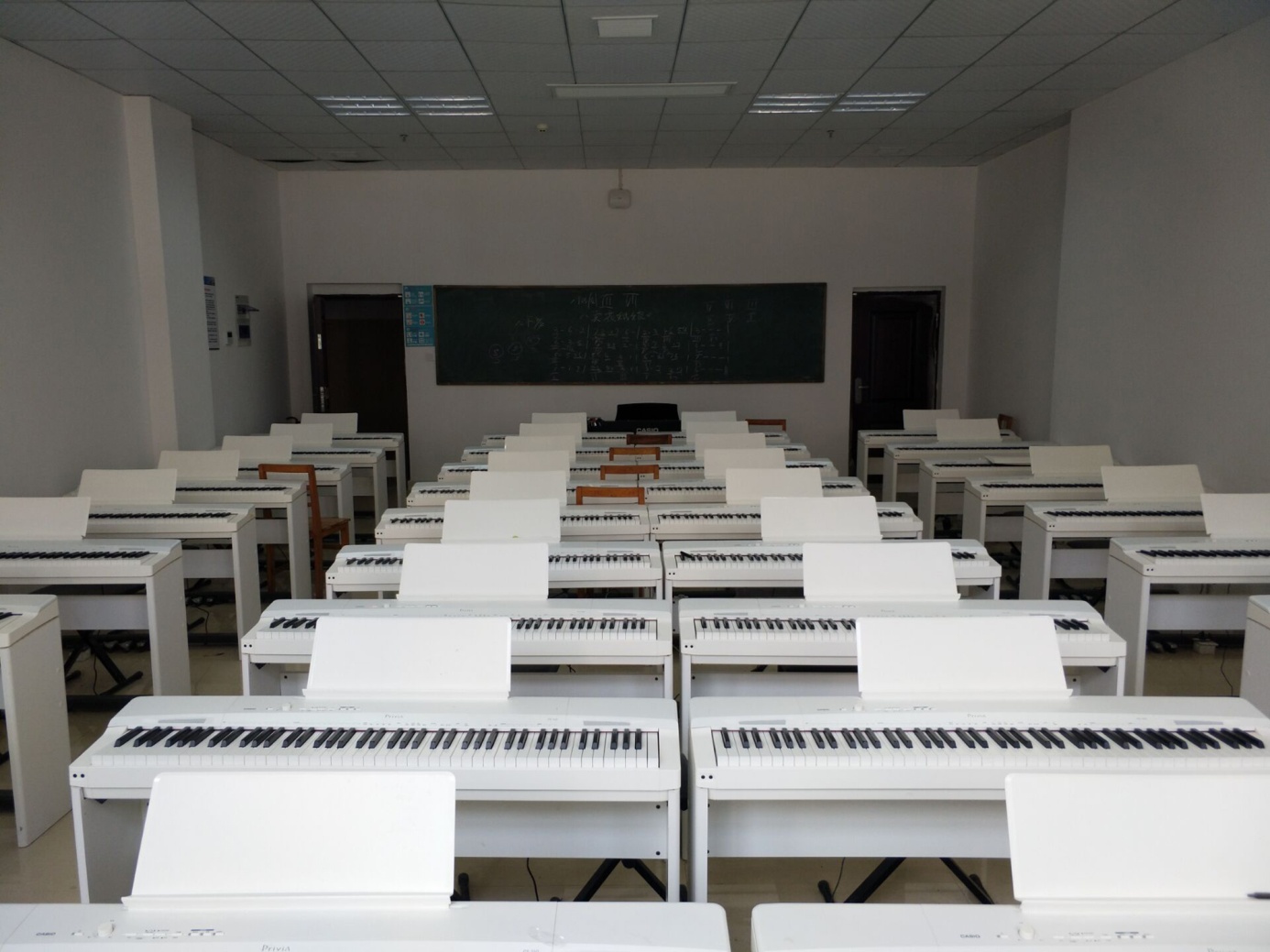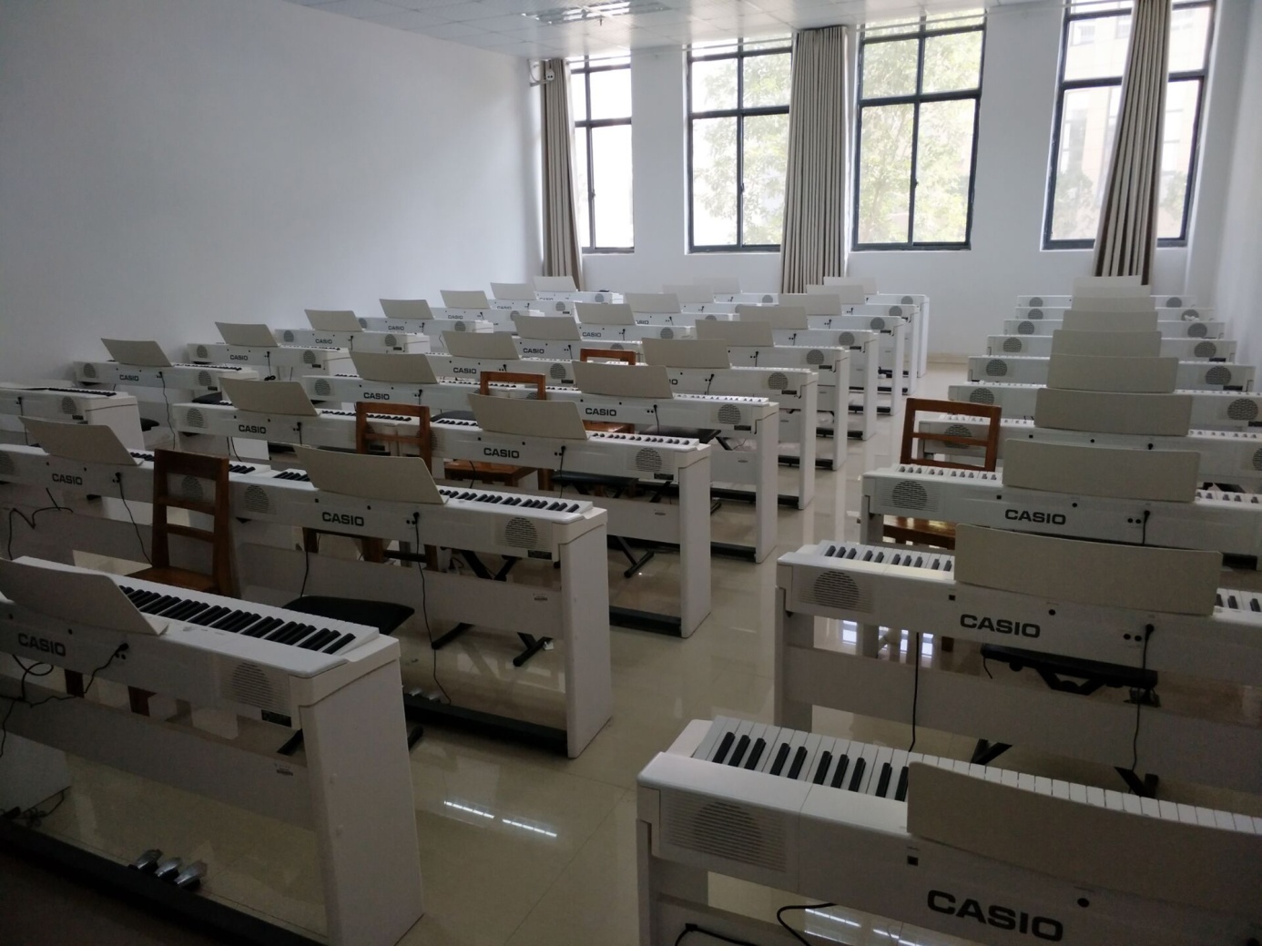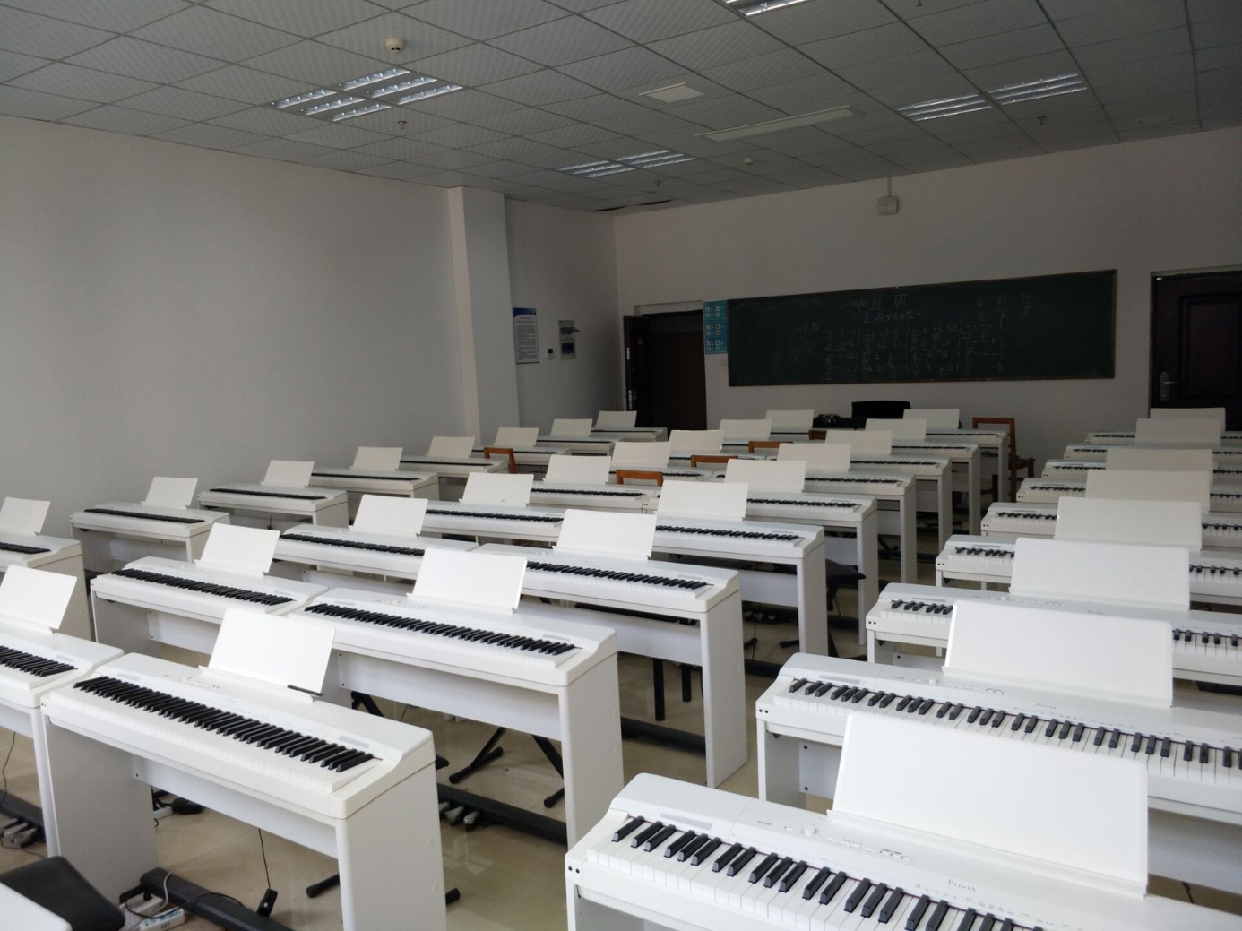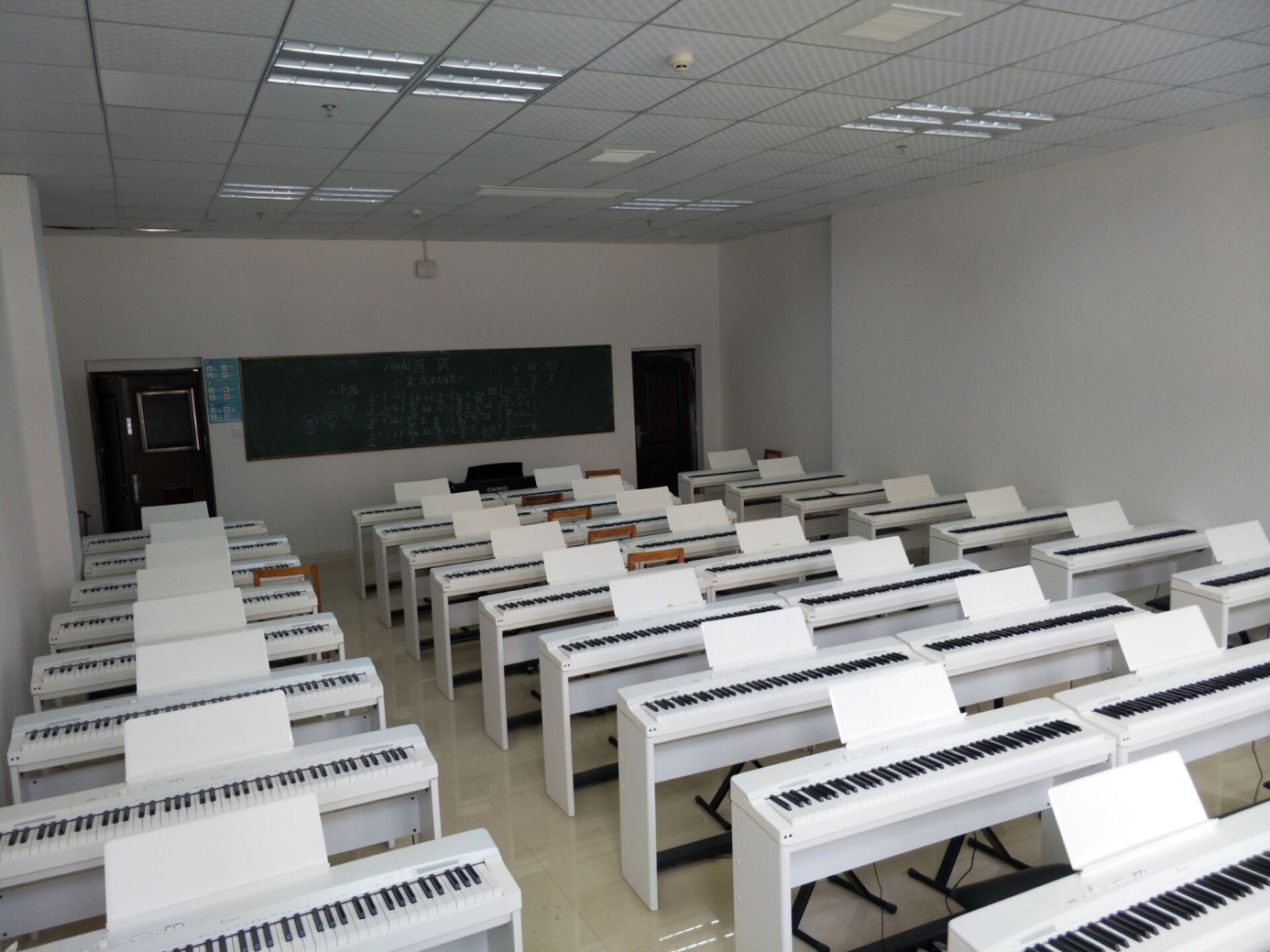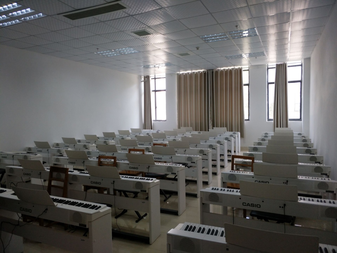 电钢教室建于2016年8月,总投资13.5万元,现有学生用卡西欧PX-160BK数码钢琴40台,教师用琴PX-758BK1台,不仅能让学生掌握钢琴弹奏的基本技巧与方法,并且还可以发挥电钢琴节拍器、多重音色、自动伴奏等功能来丰富教学手段。同时满足了钢琴集体课教学,既节约了教育资源,也为教学模式改革提供了必要条件。