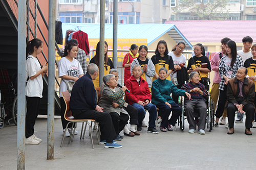 早上8点,文艺轻骑兵和骨干班成员在九江学院西门准时有序的集合完毕。在骨干班班主任的带领下,文艺轻骑兵和骨干班成员乘车半小时后到达目的地。随后同学主动到每一位老人的房间去邀请他们观看节目,老人们都十分开心。在节目准备期间,同学们搀扶老人就坐,并和老人们聊聊家常,和老人们分享一些养生小知识。