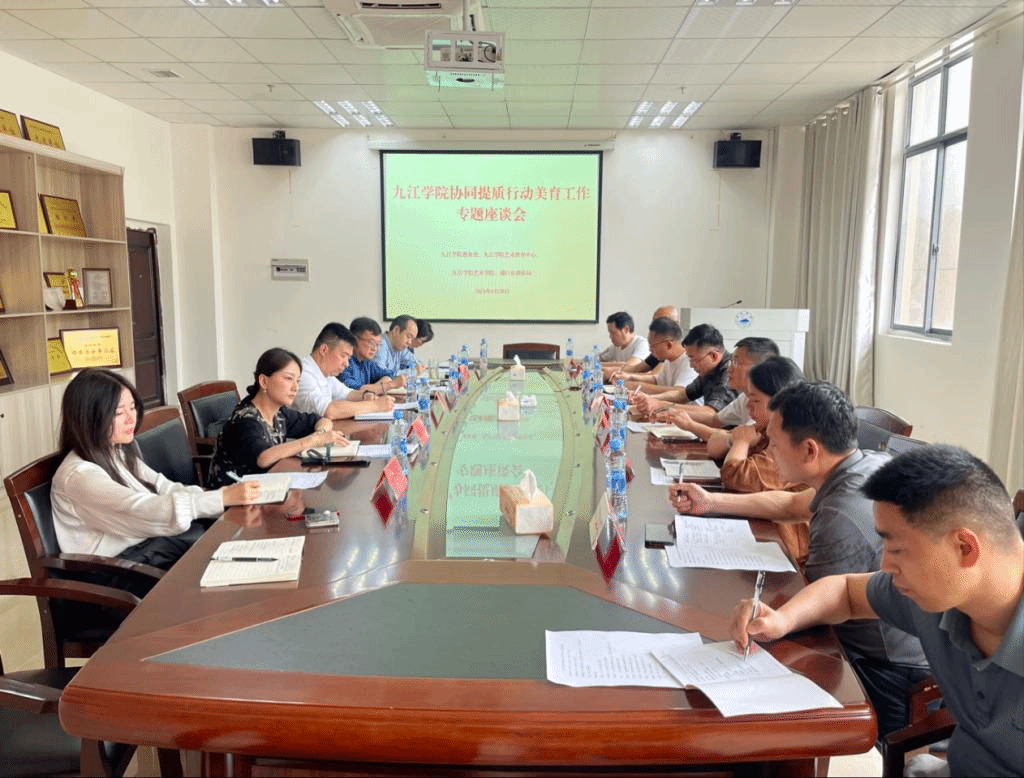 2024年4月28日下午,九江学院与湖口县教体局召开关于基础教育协同提质行动美育工作专题座谈会在太阳集团官网网址举行。九江学院教务处处长黄强、太阳集团官网网址副院长欧阳时来、艺术教育中心主任张栗娜,以及太阳集团官网网址的音乐和舞蹈各教研室负责人,湖口县教体局党委委员兼总督学吴益波和相关学校的负责人参加座谈。