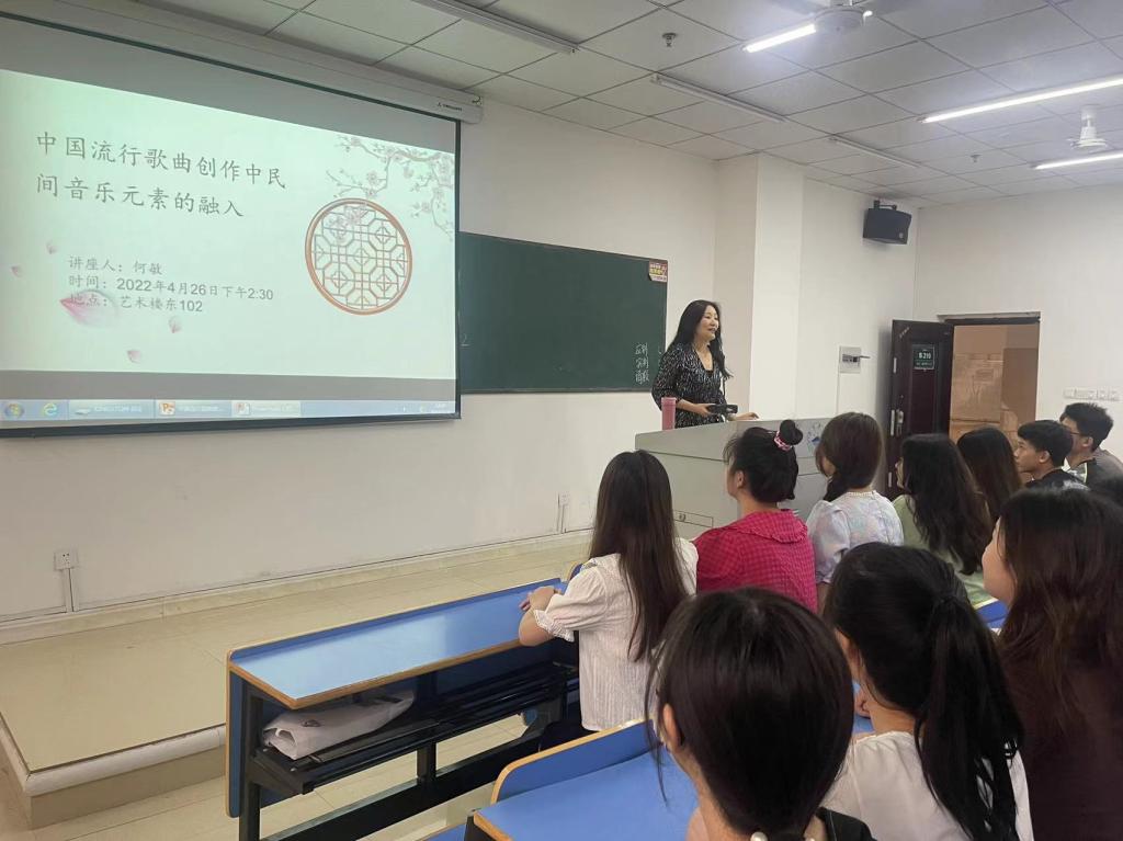 4月26日下午两点半,在艺术楼东210教室成功举办何敏副教授“中国流行歌曲创作中民间音乐元素的融入”主题讲座活动。22级、19级部分学生代表参加讲座活动。