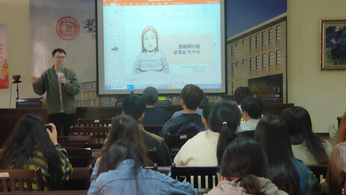 讲座中,徐田向同学们展示了他在韩国读博时的创作,为同学们展现了动漫角色创作的思路与过程。首先通过查阅资料在本子上按思路和设定,画出一个大概人物形象,然后结合设定做面部表情图案,再根据角色的设定画出物品、配饰等物品,最后确定角色的配色方案。他向同学们展示了“五花肉小姐”的创作,“五花肉小姐”是根据一个剧本设计出来的角色,徐老师通过ppt介绍了“五花肉小姐”的人物设定和与“五花肉小姐”有关的角色设计,使同学们更深入地了解动漫角色设计的创作。