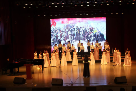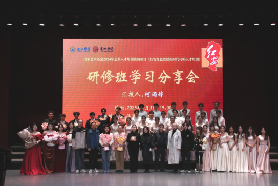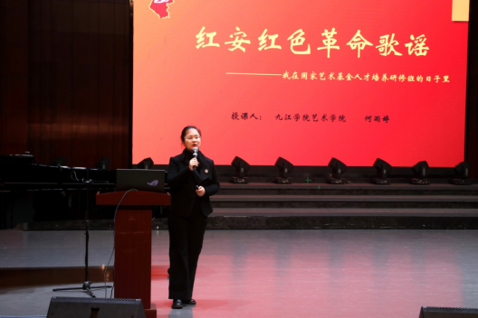 此次分享会是何雨婷老师作为国家艺术基金在全国招收录取的30位学员之一的研修班学习分享汇报。本次汇报何博士从红安地域文化入手,全面地为大家呈现了红安革命历史、红安红色文化、红安红色歌谣的艺术特征,深入解读了红安的红色革命精神。分享会上学生团队向观众们展演了合唱作品《八月桂花遍地开》、歌曲《哥哥不来花不开》、《红安红》、《黄安颂》以及《红韵中国梦》,这些作品巧妙的融合了红色革命元素,激励了人们为实现中华民族伟大复兴而奋斗。汇报会上何博士还精心演绎了经典红安红色歌谣《送郎当红军》、《妇女参军歌》与《一颗红心拿不去》表达了革命者坚定的革命意志和对党的无限忠诚。还介绍了红安的非物质文化遗产及民间文学《十八老子的故事》,这些源自民间且在人民群众中广泛流传的故事,反映出红安人民的智慧与自强不息的精神。既是红色文化资源,也是重点的非物质文化遗产。分享会在激昂的旋律《红安永远红》中结束,听众们沉浸在红色文化的震撼与感动之中。