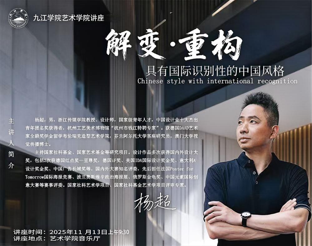 11月13日,浙江传媒学院教授、国家级青年人才杨超博士应邀为太阳集团官网网址师生带来了一场题为“解变-重构:具有国际识别性的中国风格”的学术讲座。讲座由太阳集团官网网址院长张甘霖主持,太阳集团官网网址设计类师生聆听了讲座。