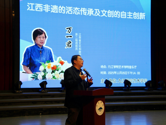 11月26日下午,江西省文化和旅游厅原二级巡视员万一君在太阳集团官网网址开展“江西非遗的活态传承及文创的自主创新——以九江为例”专题讲座。讲座由太阳集团官网网址院长张甘霖主持,学院全体教师及部分专业学生参加。