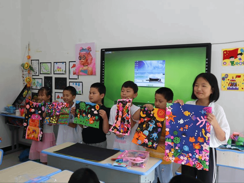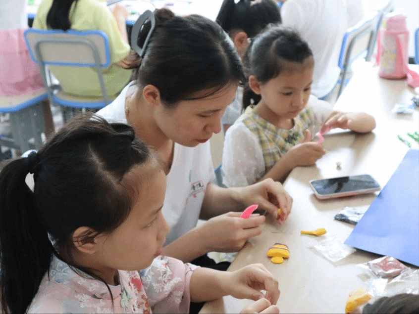 上午,队员们给小孩们上了最后一节粘土课,课程内容是以小组为单位做粘土场景。队员先是把小孩分成了六组,再把小老师分配在每一组边上指导孩子完成粘土作品。在小老师们的耐心指导下,“海底世界”,“彩虹庄园”“科幻太空”等粘土场景作品都呈现在大家面前。