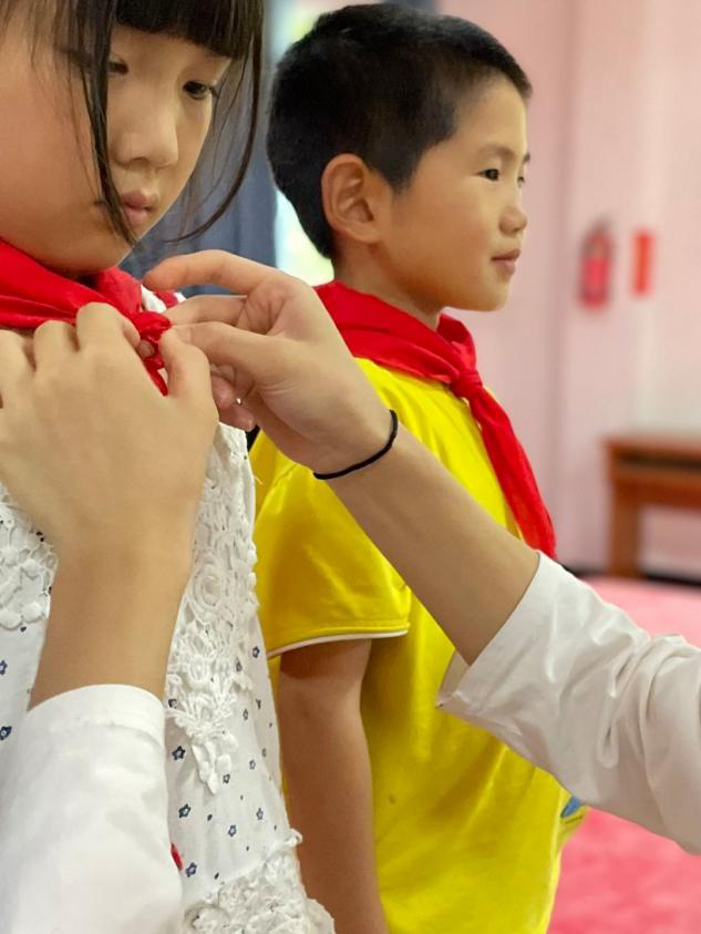 图为志愿者在为孩子们正确佩戴红领巾。