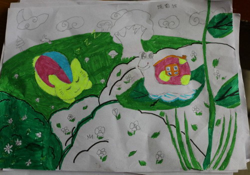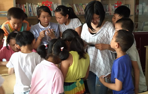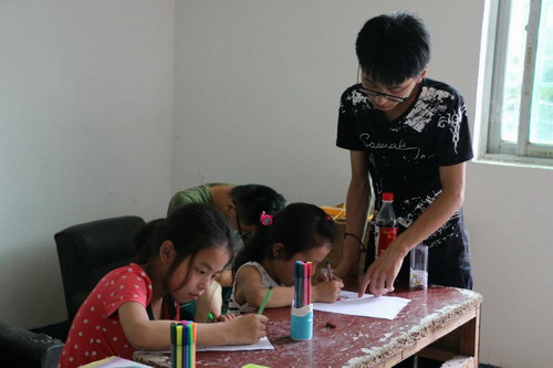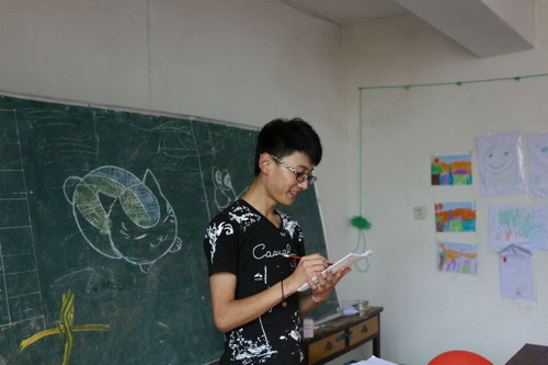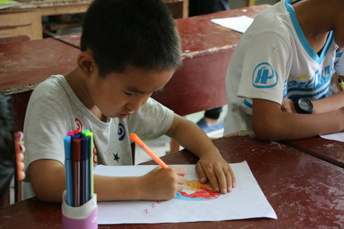 当地的孩子们年龄跨度较大,所以小老师们制订了合理的教学内容。先是美术课,小老师们给每一个小朋友分别发放了铅笔,橡皮和纸,在碰到不会画的孩子时,老师都仔细的教给他们步骤,耐心的给他们讲解方法,看着小小的画笔在纸上划过,一幅幅承载着孩子们童心和想象力的作品完成,我们“三下乡”的队员们都有着无与伦比的成就感;然后是音乐课,这也是孩子们最喜欢的时间,孩子们会随着老师的节拍一起发声、一起发音,气氛热情活泼,音乐的感染力顿时传播到每一个孩子的心中。