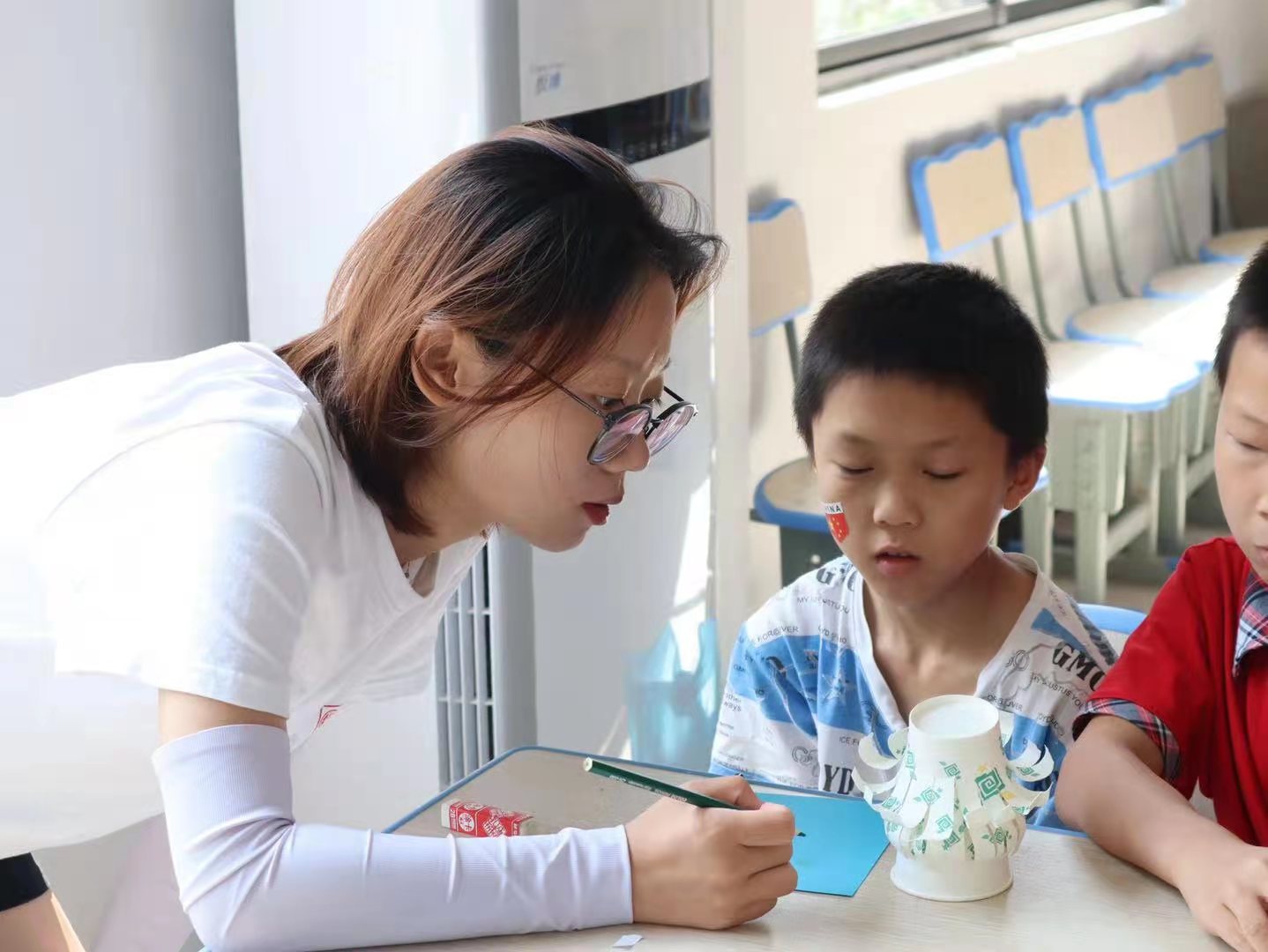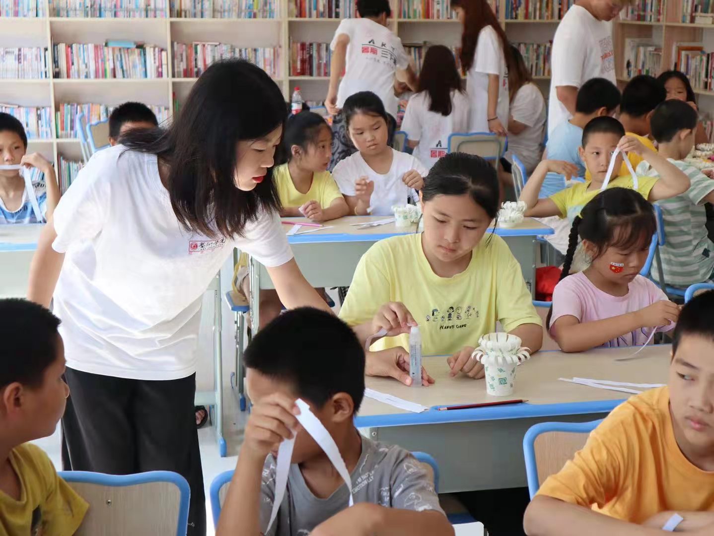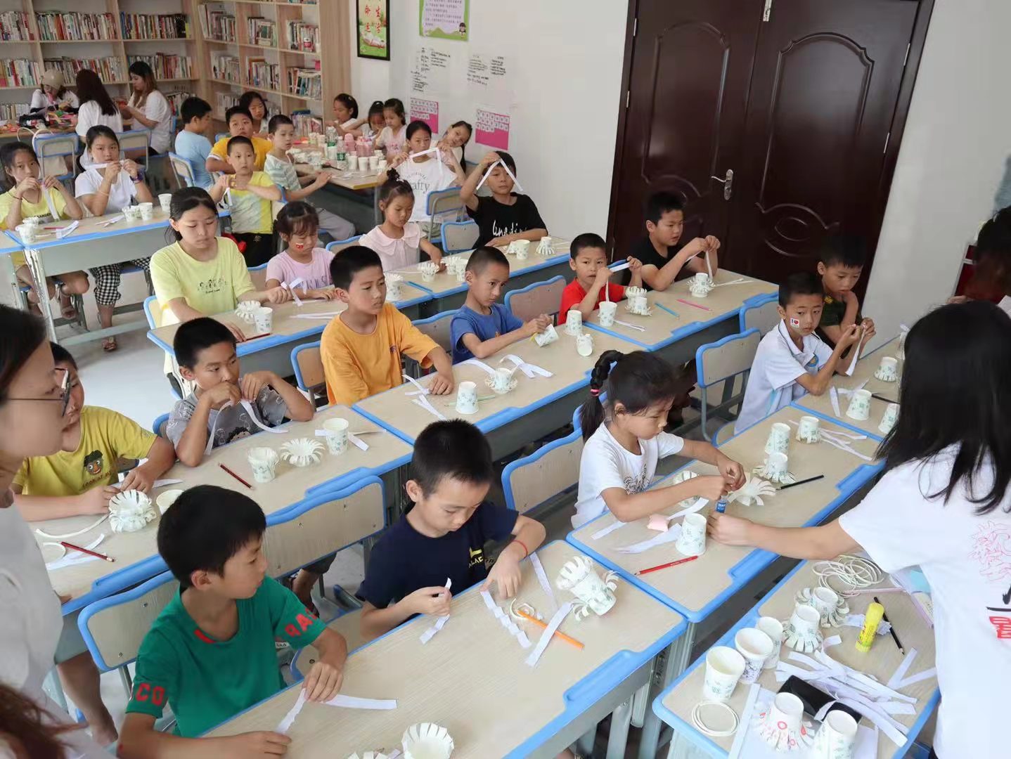 上午,队员们开设了手工课,以“变废为宝”为主题,教孩子们将自己用完的纸杯,通过裁剪,粘贴,卷曲变成一个精美的装饰品,队员们还在教学过程中教小朋友们保护地球,节约资源,要从现在开始,从小事做起。