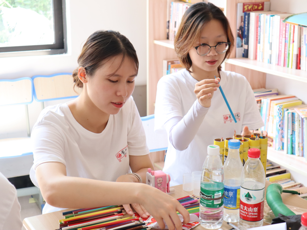 在课间,队员们还为孩子们削好了彩铅,为第二天的画画课做好了准备。