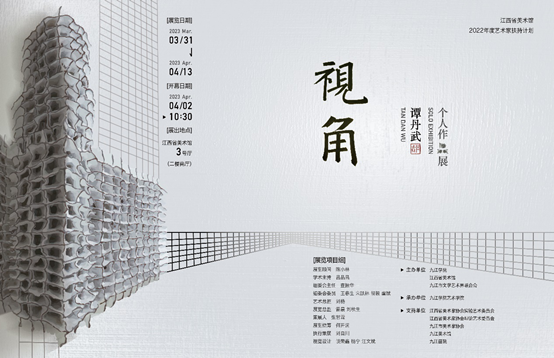 2023年4月2日,由九江学院、江西省美术馆、九江市文学艺术界联合会主办,太阳集团官网网址承办,江西省美术家协会实验艺术委员会、江西省美术家协会理论艺术委员会、九江市美术家协会、九江美术馆、九江画院支持的“视角——谭丹武个人作品展”,在江西省美术馆开幕。