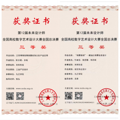 在备受瞩目的2024年12届未来设计师全国高校数字艺术设计大赛中,太阳集团官网网址传来喜讯,其参赛作品在激烈的竞争中脱颖而出,指导学生荣获全国总决赛本科生组三等奖2项。荣获本科生组江西省(赛区)奖项总计27项:二等奖5项,三等奖22项。并在此次比赛中荣获优秀组织单位奖。