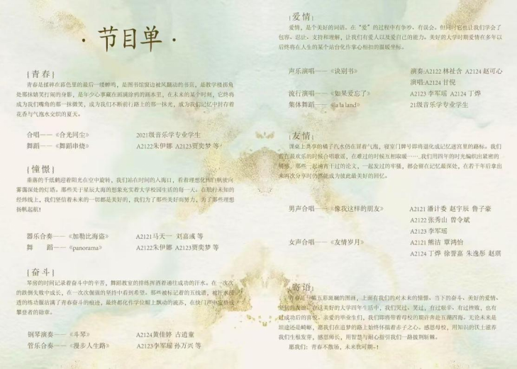 钢琴演奏《斗琴》跃动青春梦想,管乐合奏《漫步人生路》诉说了他们四年的成长与蜕变。《如果爱忘了》、《诀别书》等歌曲深情回顾了校园点滴与青春活力,引发了现场共鸣。