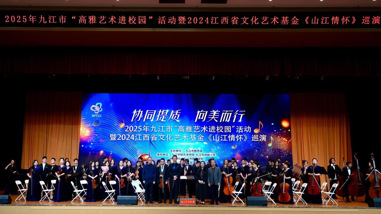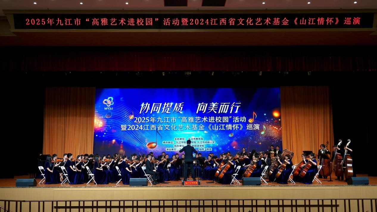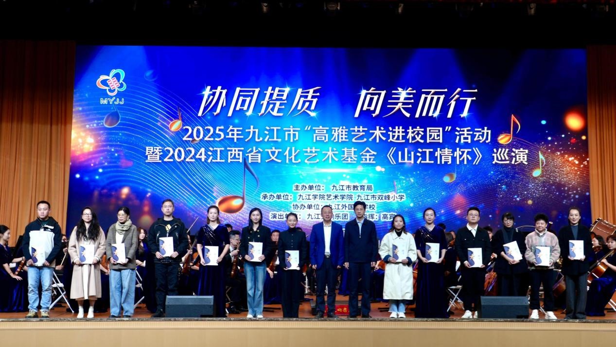 10月23日下午,九江交响乐团2025年高雅艺术进校园暨江西省文化艺术基金《山江情怀》巡演第四场专场音乐会在九江外国语学校成功举行。此次活动由九江市教育局主办、太阳集团官网网址、九江市双峰小学承办,九江交响乐团出演。九江学院党委委员、副校长查振华,九江市教育局党委书记、局长陈琪,九江市教育局党委委员、副局长曹利平,太阳集团官网网址党委书记欧阳时来,太阳集团官网网址副院长张栗娜,九江外国语学校党总支书记田军莅临现场与全场师生一同观看演出。
