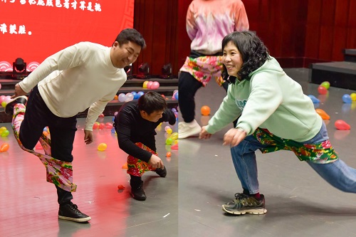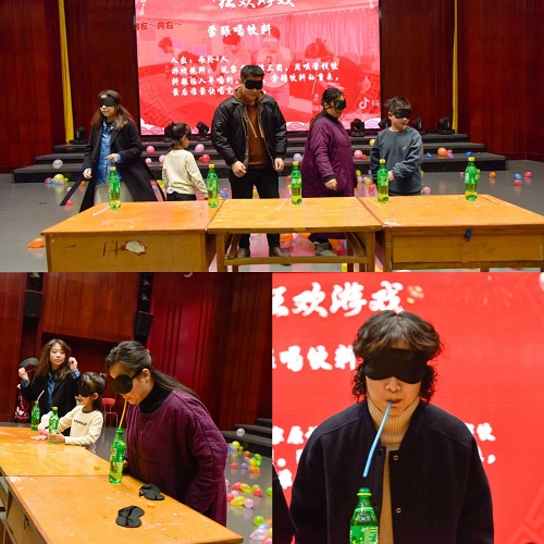 随后,花式穿裤子、蒙眼喝饮料、谐音梗猜词语、光盘拔河等趣味游戏轮番上演。花式穿裤子环节中,老师们充分发挥身体协调性,不用双手完成穿裤挑战,滑稽又认真的模样引得全场哄堂大笑;蒙眼喝饮料游戏里,选手们原地转三圈后凭感觉寻找饮料瓶,跑偏、拿错的状况频频发生,笑声此起彼伏;谐音梗猜词语环节,富有创意的图片让老师们脑洞大开,争相抢答;光盘拔河游戏中,两位选手腰间系绳,通过扭动腰部带动光盘移动,力与巧的结合让赛场氛围紧张又热烈。