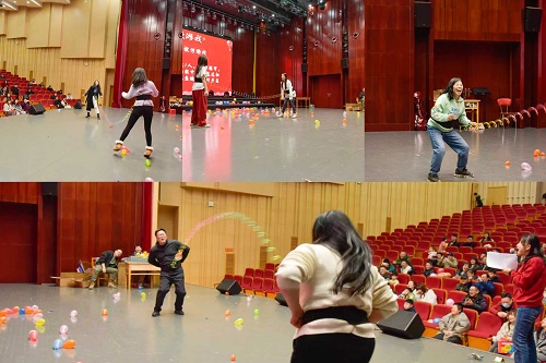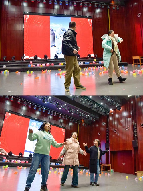 游戏间隙的才艺表演更是为联欢会增色不少。悠扬的琵琶弹奏婉转悦耳,让现场观众沉浸在古典音乐的魅力之中;深情的个人独唱情感真挚,赢得台下阵阵喝彩;模仿舞蹈表演环节,老师们化身 “海豹”,模仿四种不同舞种的经典动作,夸张的肢体语言与生动的表情演绎,将现场气氛推向高潮,最终表现最佳的老师获得了大家的一致认可。